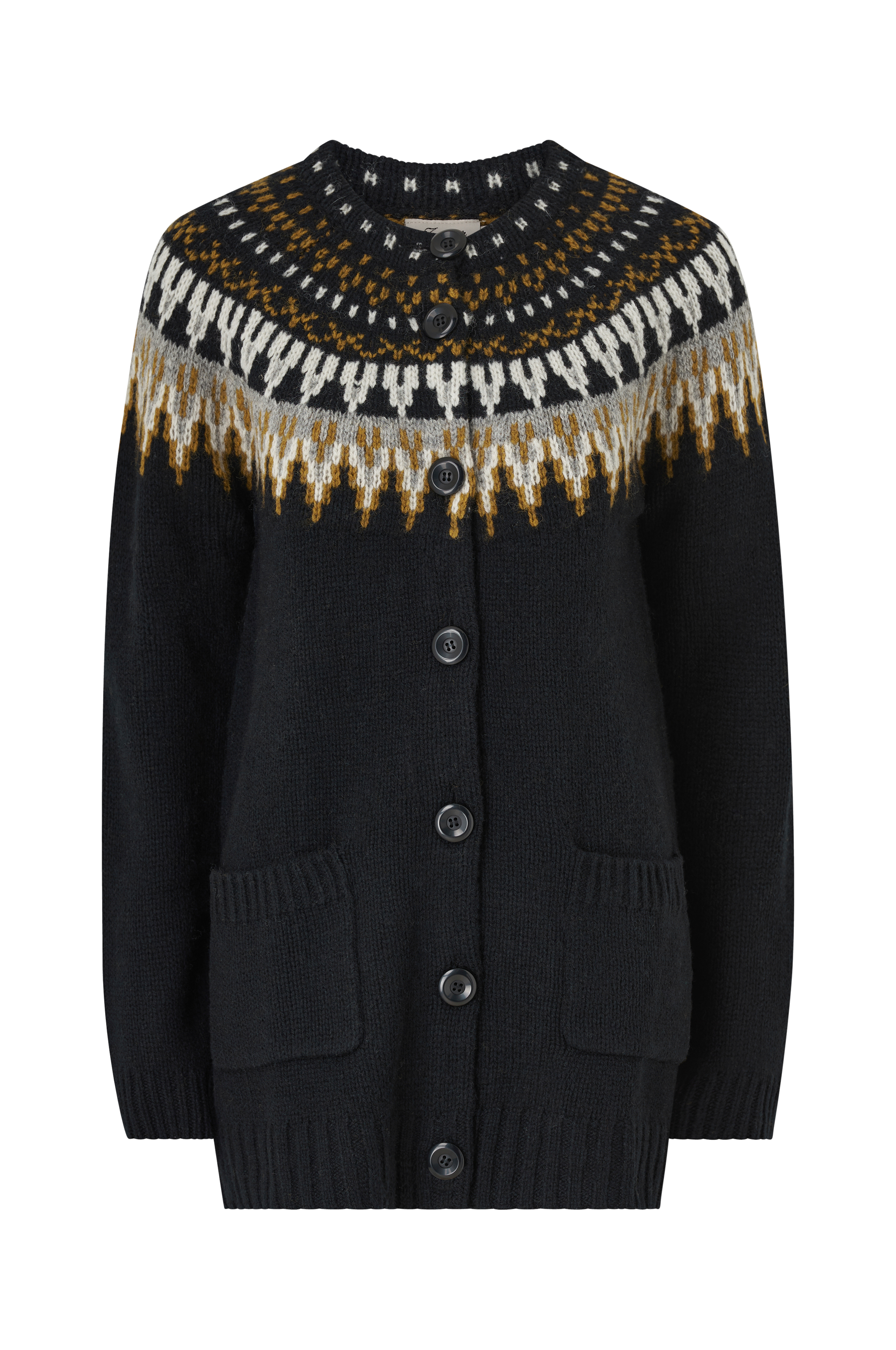 • Lang, let udsvingende model med mønsterstrikning på toppen• Rund hals• Store knapper foran• Langt raglanærme• Lommer• Ribstrikkede kanter nederst og ved manchetterne