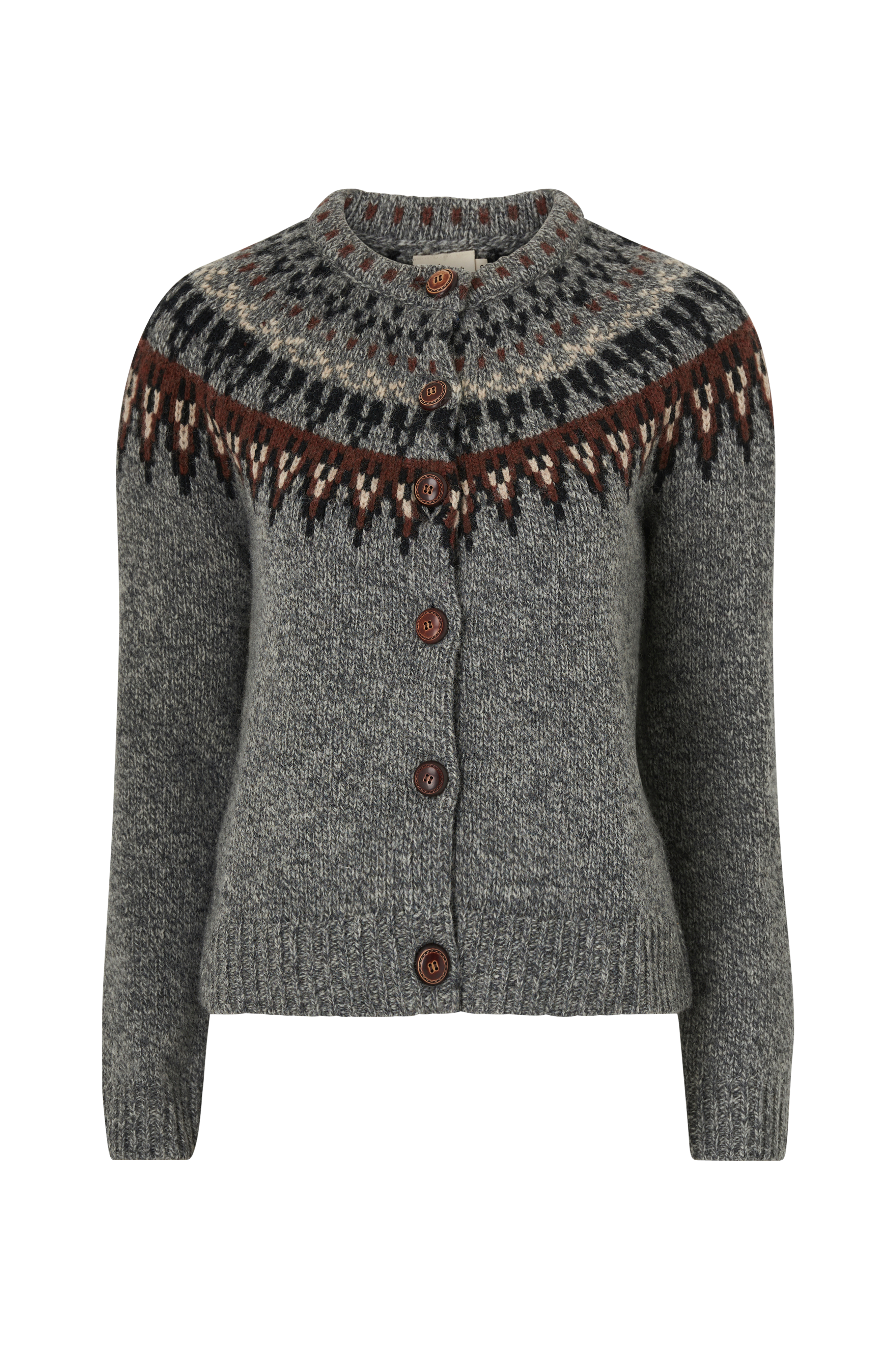 • Lige model med mønsterstrikning på toppen• Rund hals• Dekorative knapper foran• Langt raglanærme med strikket, matchende albuelap• Ribstrik ved manchetterne og ved nederste kant