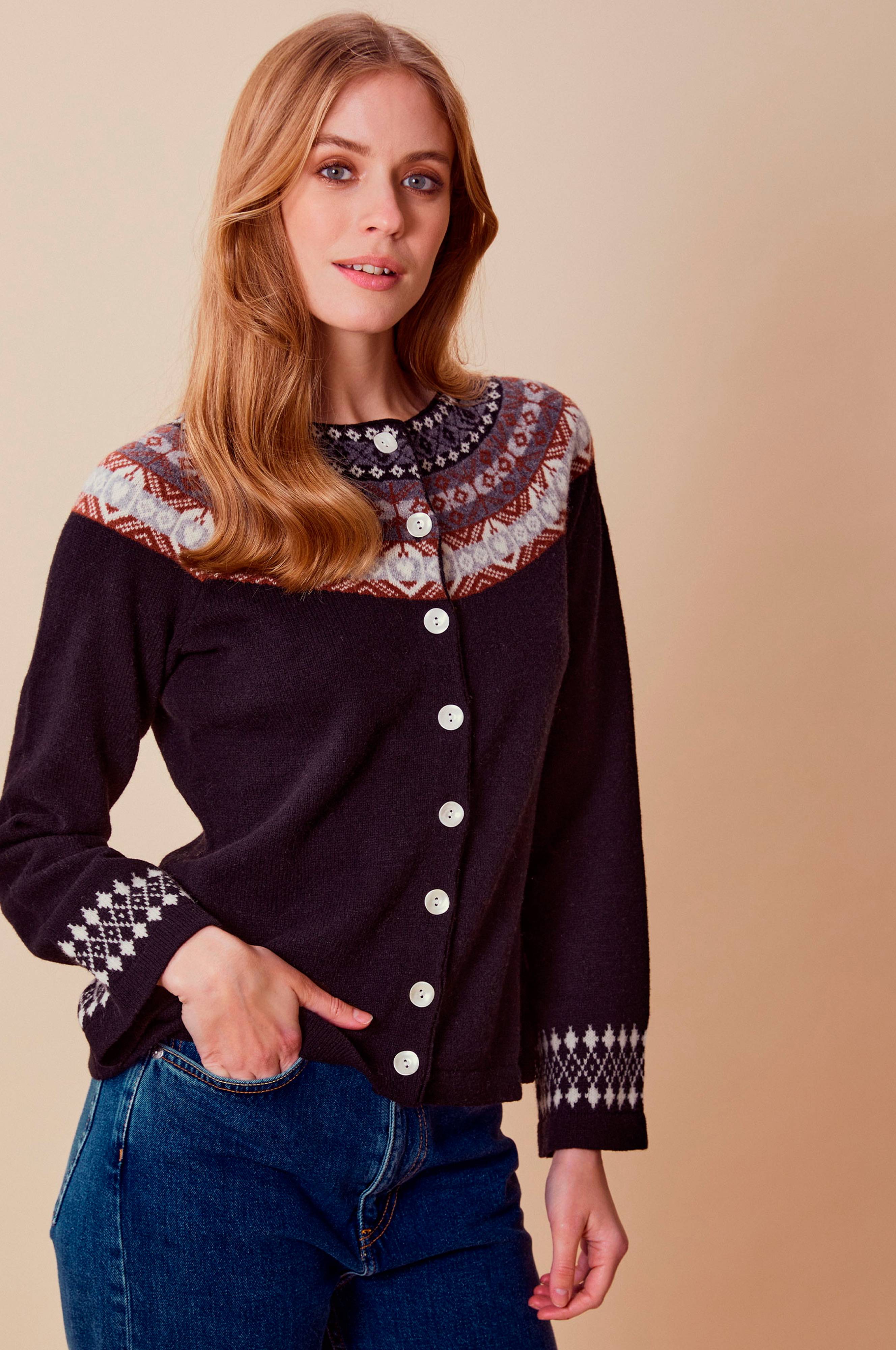 • Model med afrundet mønsterstrikning• Smal rullekant i halsen og langs forkanten• Dekorative knapper• Bredt raglanærme