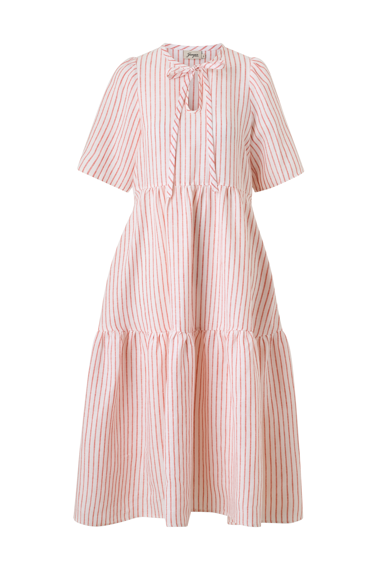 • Stribet kjole i hør• Model med svaj med vidde• V-udskæring med bindebånd• Ballonærmer• Længde: 125 cm i størrelse S