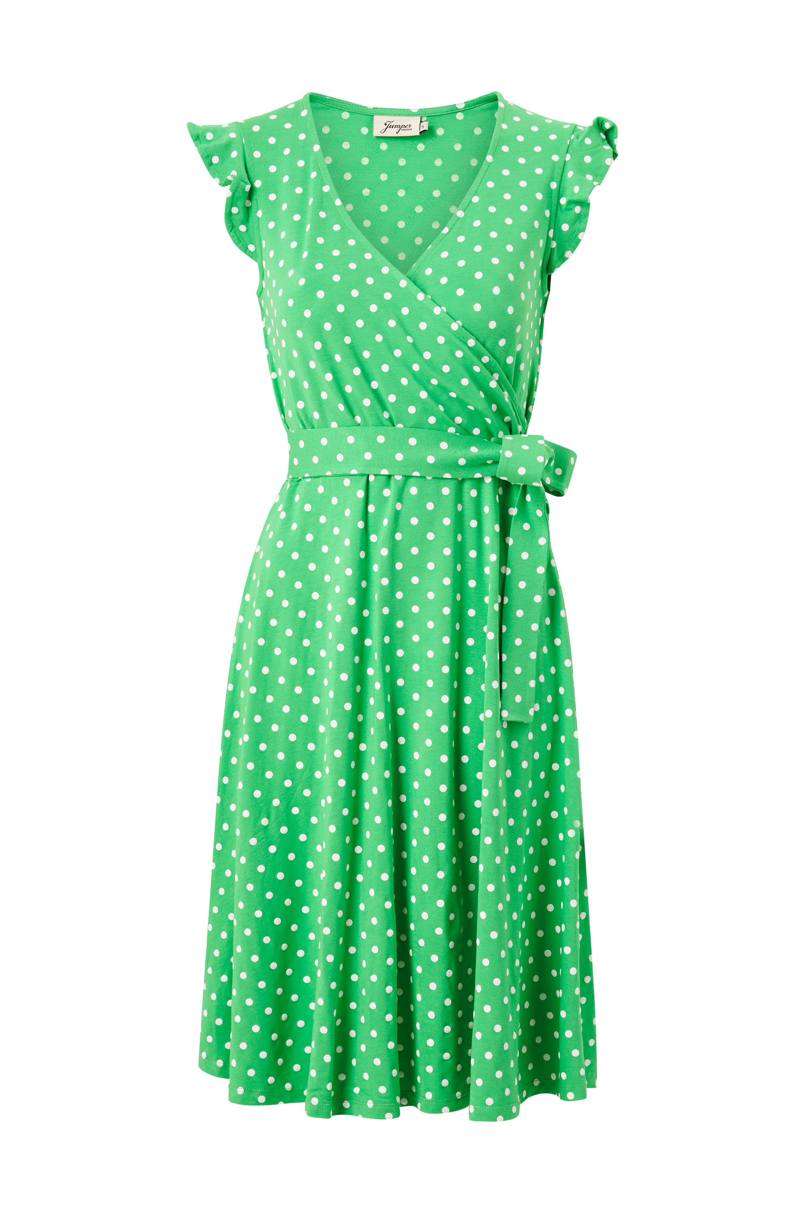 Prikket jerseykjole af viskose. Tætsiddende overdel i slå-om og en vid nederdel som slutter ved knæet. Bindes i taljen med aftageligt bånd. Ærmeløs, med flæsedetalje ved skulderen. Længde ca. 103 cm i str. S.