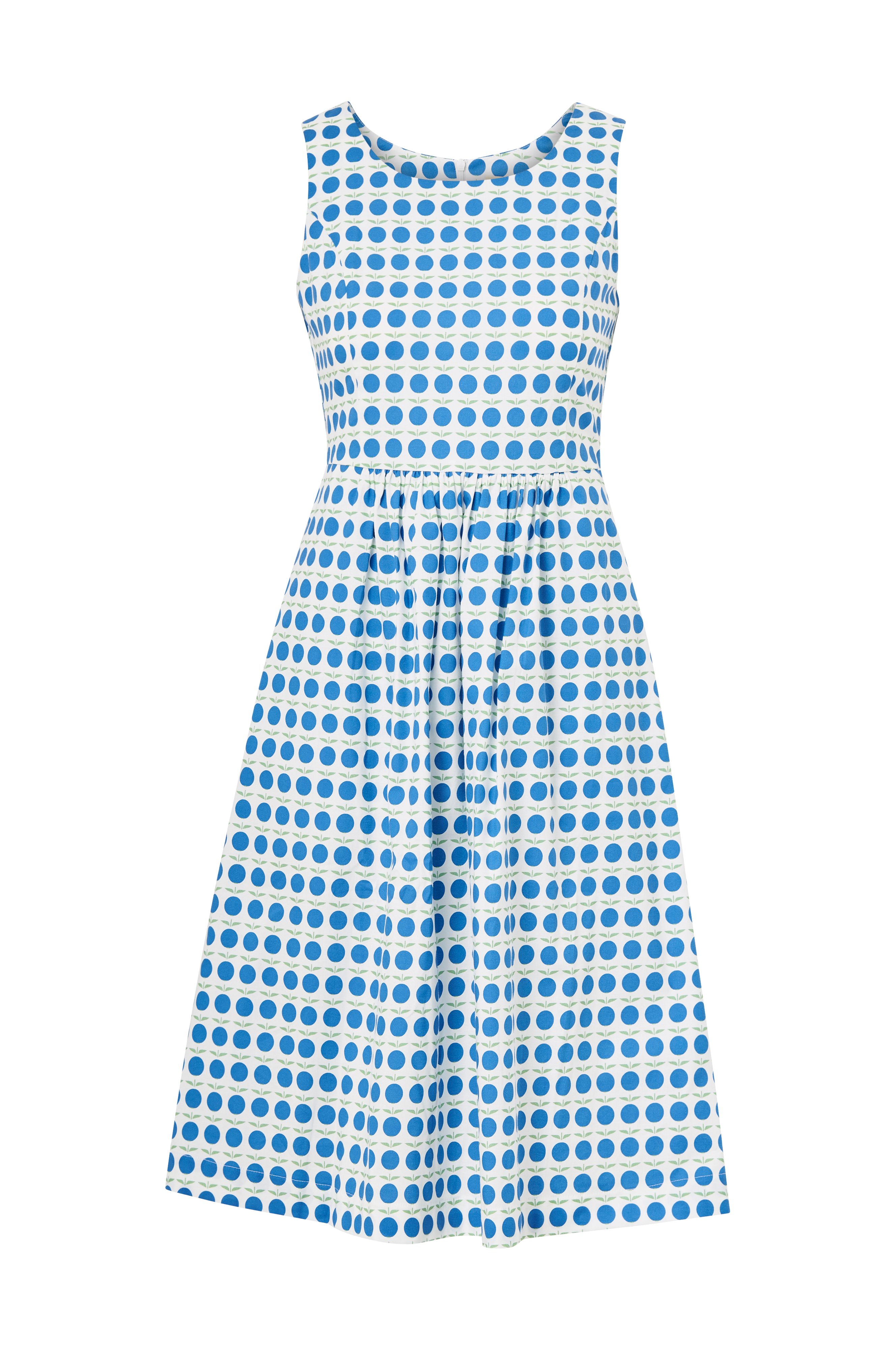 Ærmeløs bomuldskjole i smukt retromønster med røde æbler. Feminin pasform med stram top og flatterende brystsnit. 50'er-model med markeret talje og stor vidde i nederdel. Rund hals, skjult lynlås i ryggen og slutter ved knæet. Længde ca. 103 cm i str. 36.