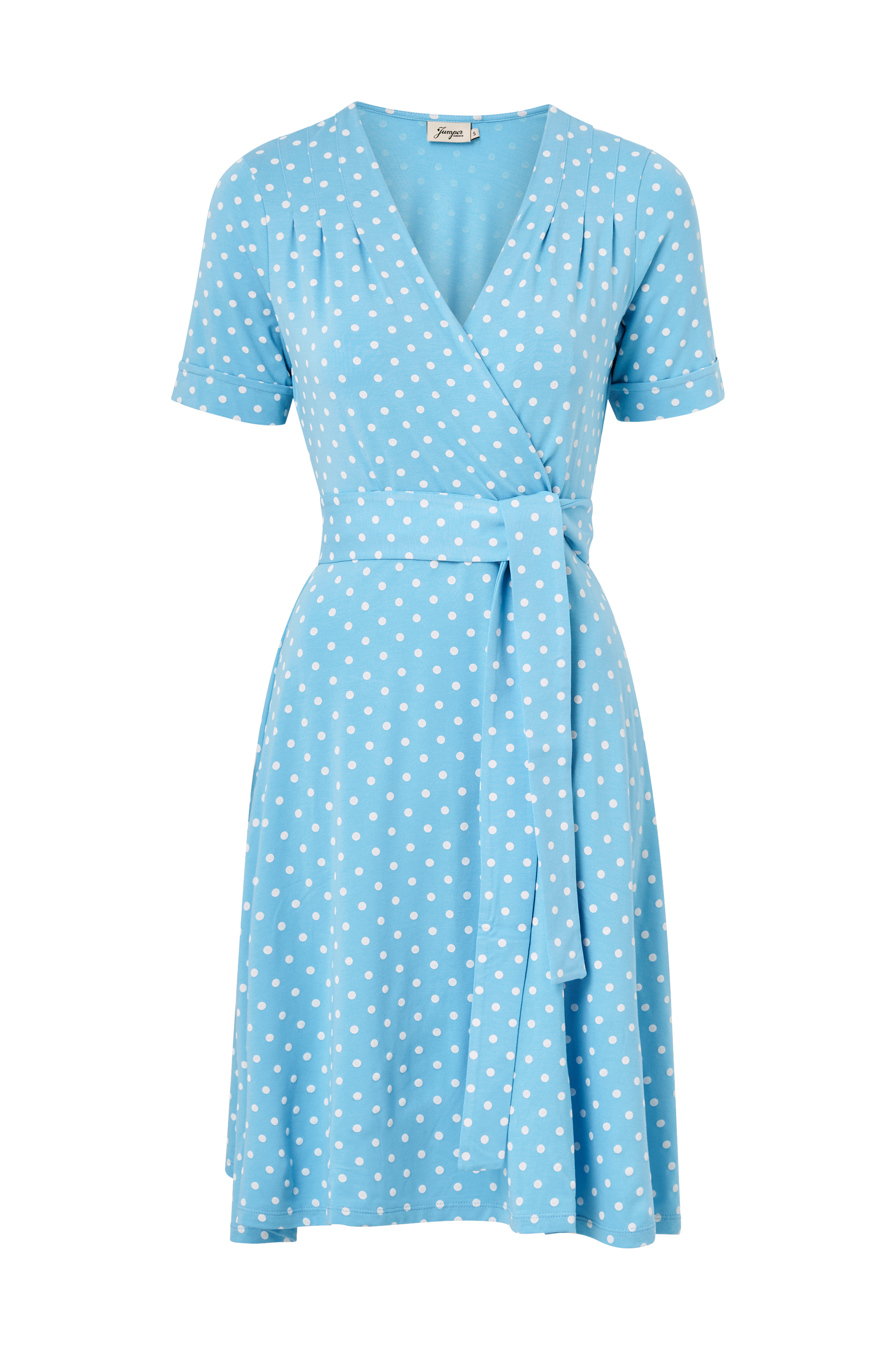 Feminin kjole med slå om-overdel og syede læg ved skuldrene. Afskæring i taljen med vid underdel som slutter under knæet. 3/4-ærme som har et lille opslag. Aftageligt bælte i taljen. Det prikkede stof er i skøn viskose, som giver et fint fald. Længde ca. 102 cm i str. S.