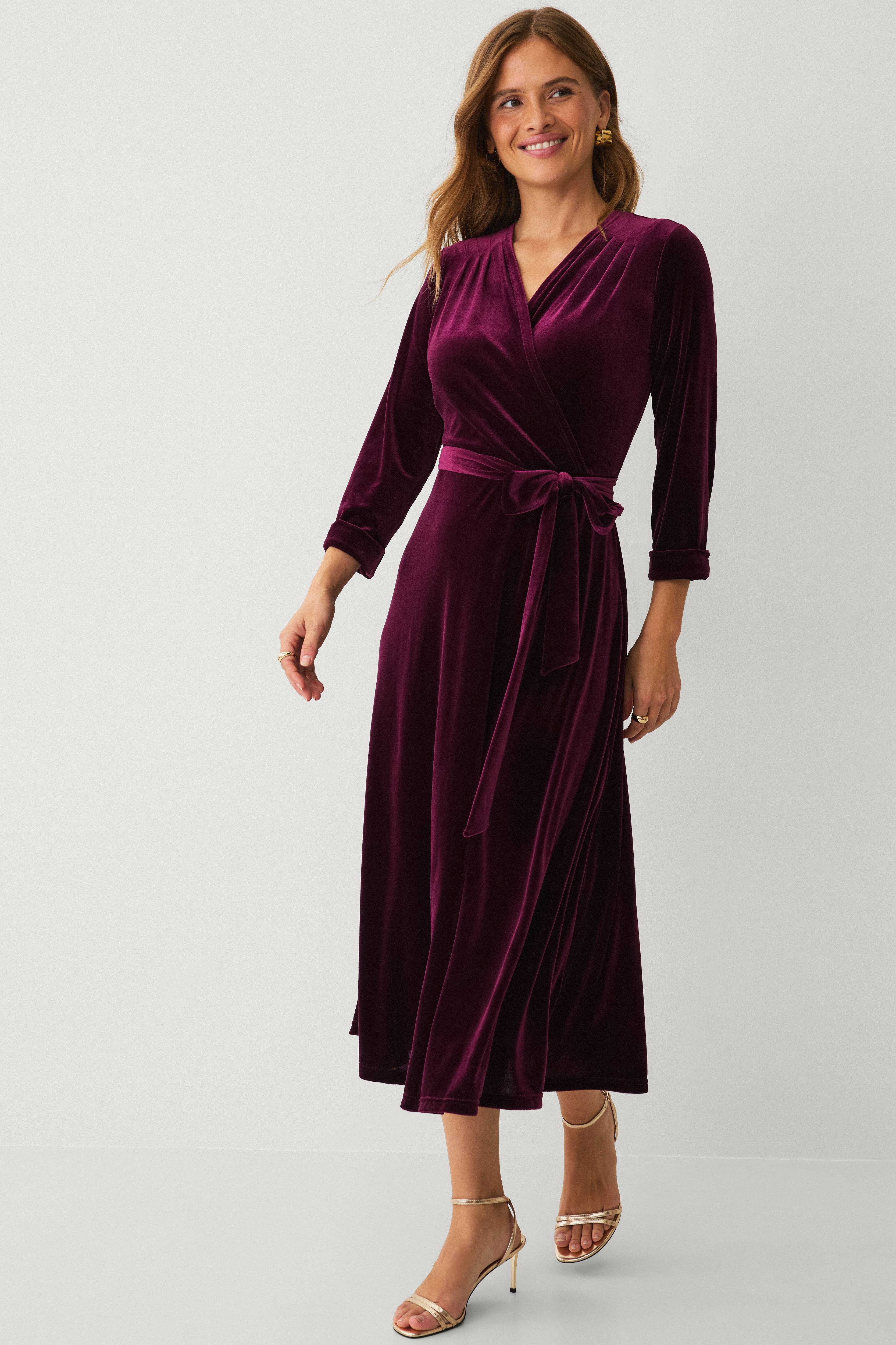 • Kjole i velour• V-udskæring• Lange ærmer• Foldede ærmeafslutninger• Bindebånd ved taljen• Bølgeformede detaljer• Normal pasform• Længde: 127 cm i størrelse S