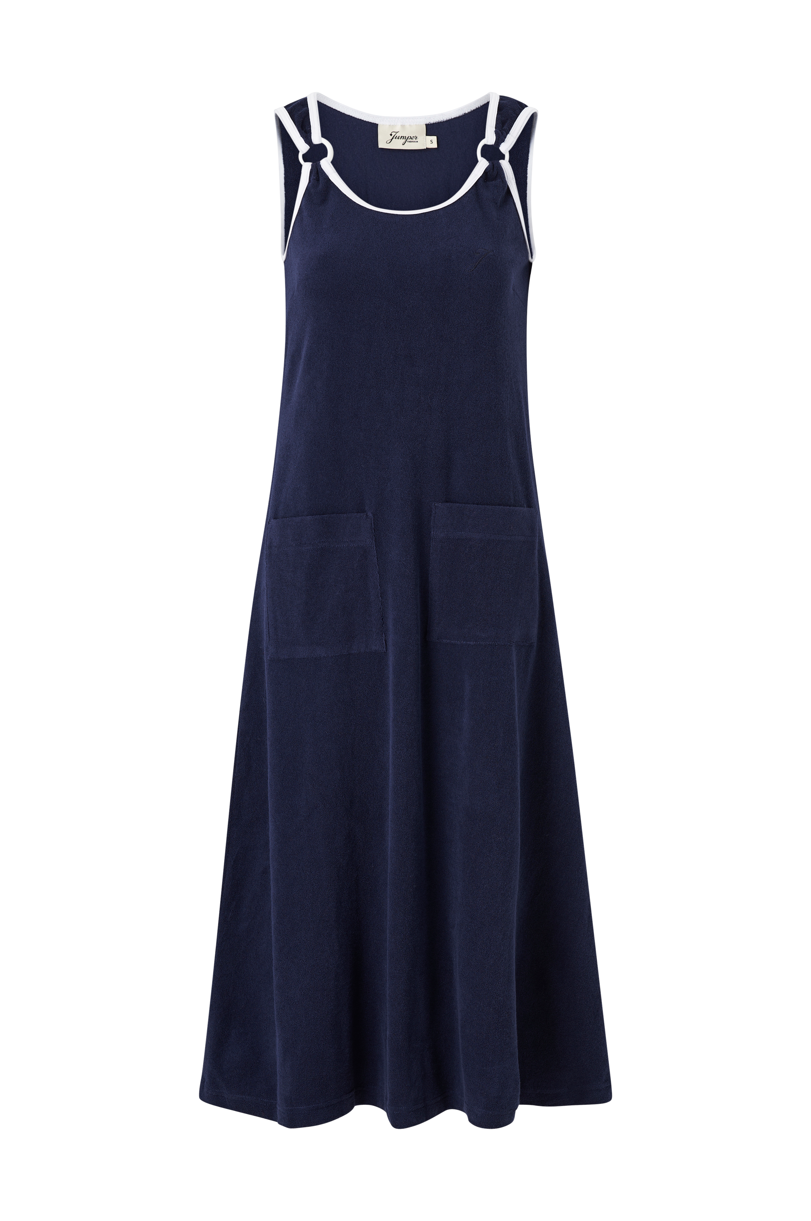 • Kjole i frotté• Ærmeløs model• A-linje design• To lommer• Dekorative ringe på skulderstropperne• Længde: 120 cm i størrelse S