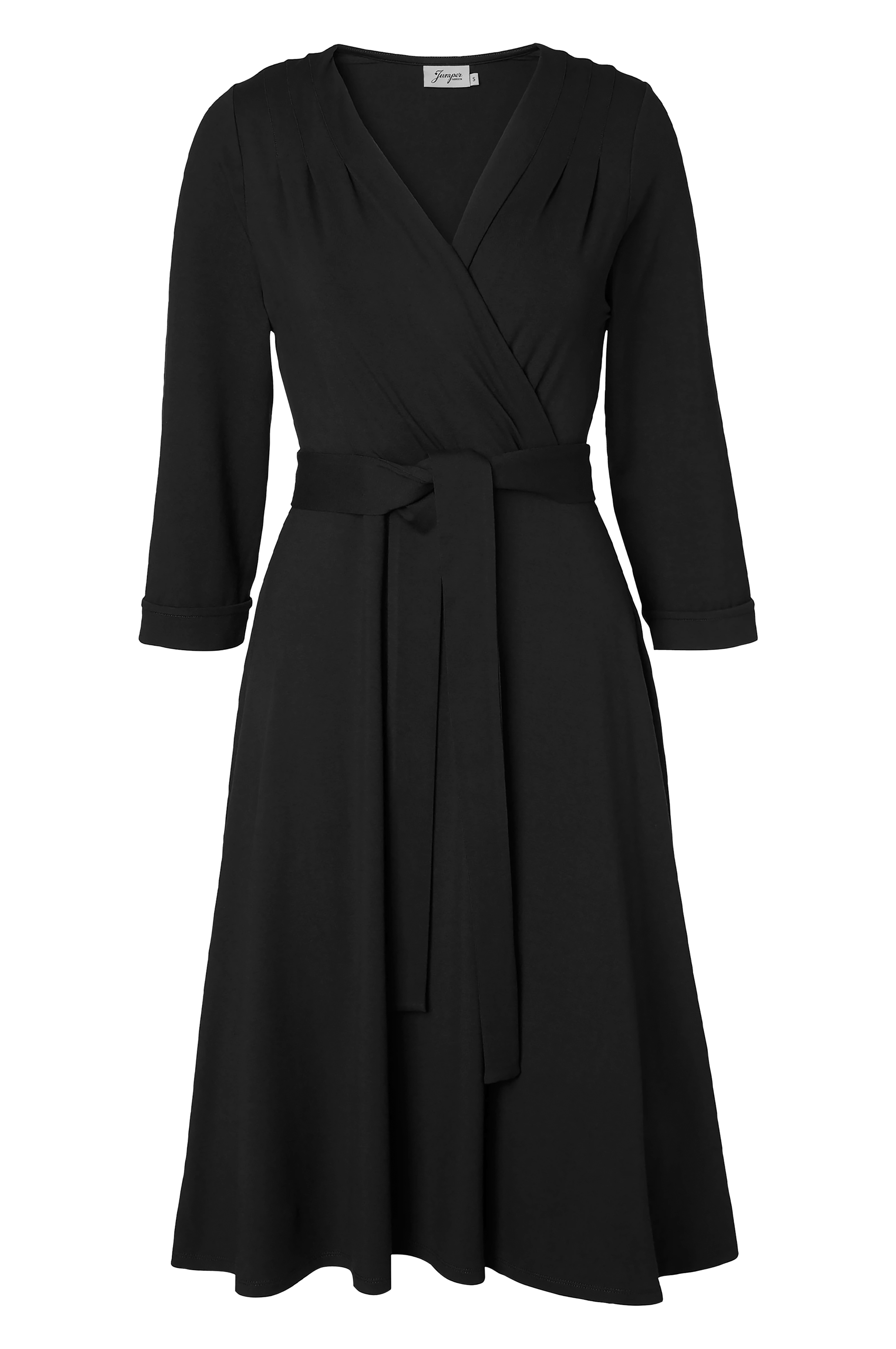 • Kjole i blød viskosejersey• V-udskæring med slå-om• 3/4 lange ærmer med oprullet• Bindebælte ved taljen• Længde: 100 cm i størrelse S