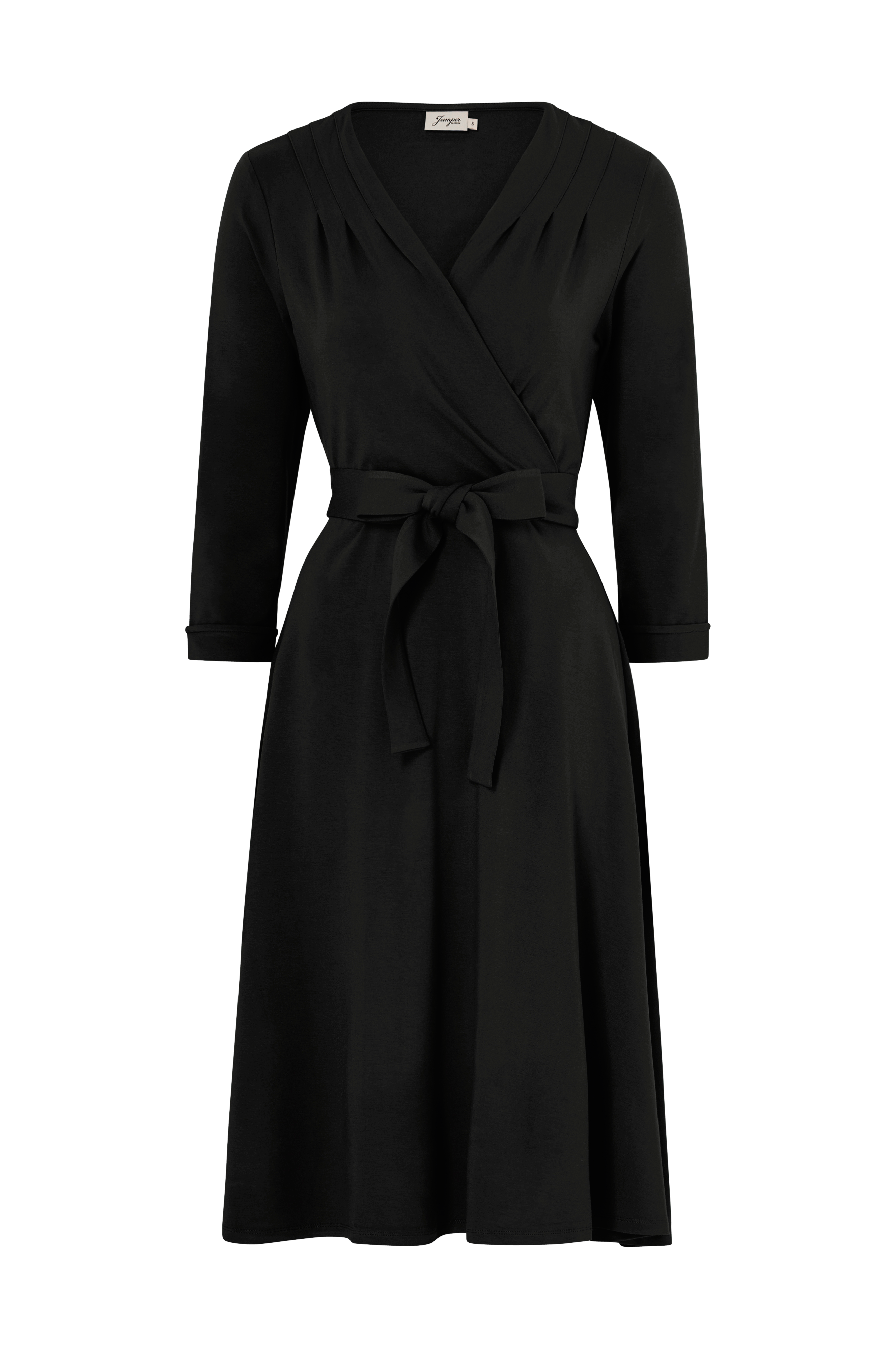 Feminin kjole med kropsnær overdel med slå-om og dekorative syede læg. Afskæring i taljen med vid nederdel som slutter ved knæet. 3/4-lange ærmer med syet opslag. Aftageligt bælte i taljen. I skøn viskose med fint fald. Længde ca. 110 cm i str. S.