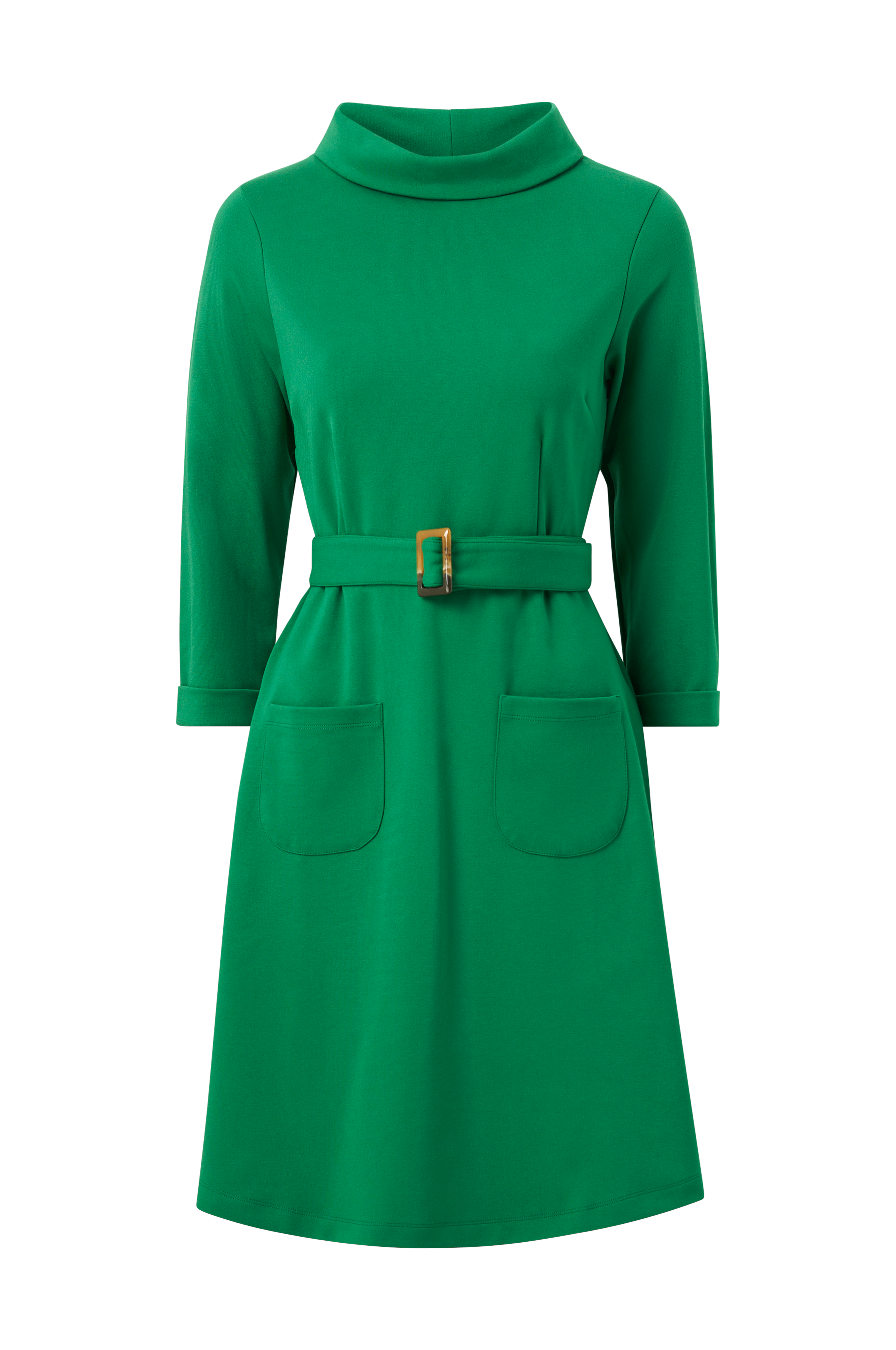 • Model med svaj i jersey• Høj, nedadvendt krave• 3/4 langt ærme med oprullet ved manchetterne• Talje med bælte• Påsyede lommer• Længde: 97 cm i størrelse S