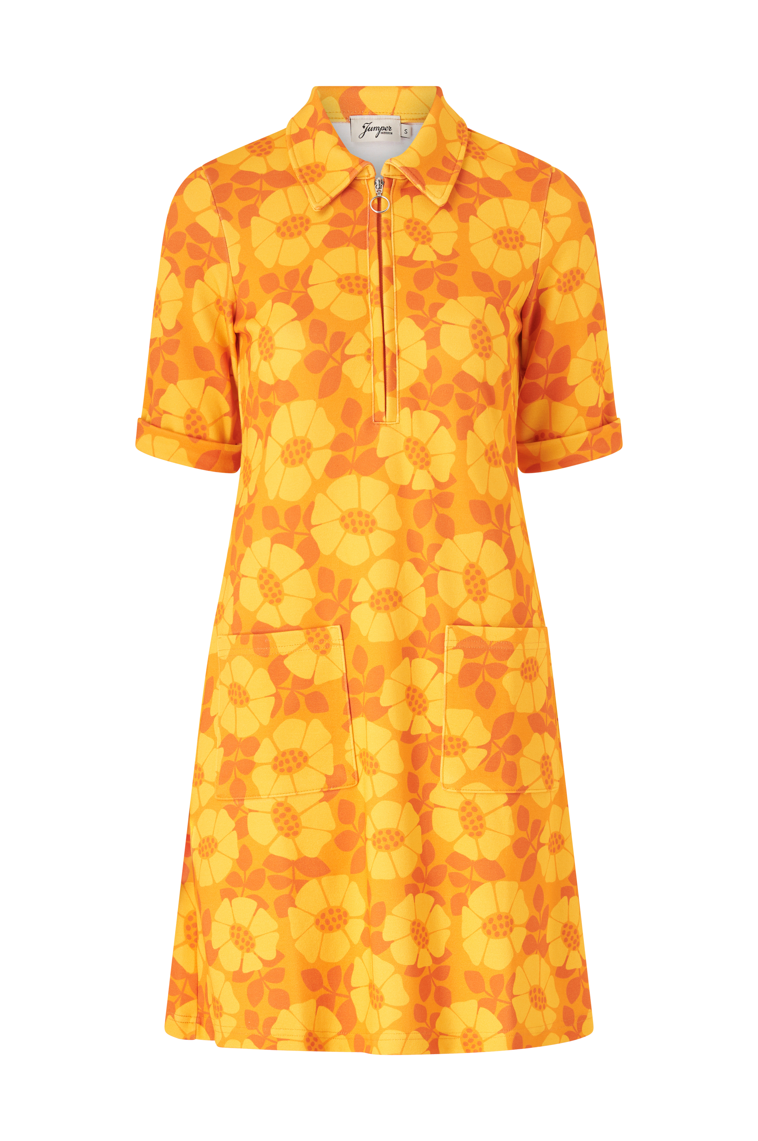 • Retroinspireret mønster• A-linje design• Krave• Skjult lynlås foran• Synlige forlommer• 3/4 lange ærmer• Længde: 89 cm i størrelse S