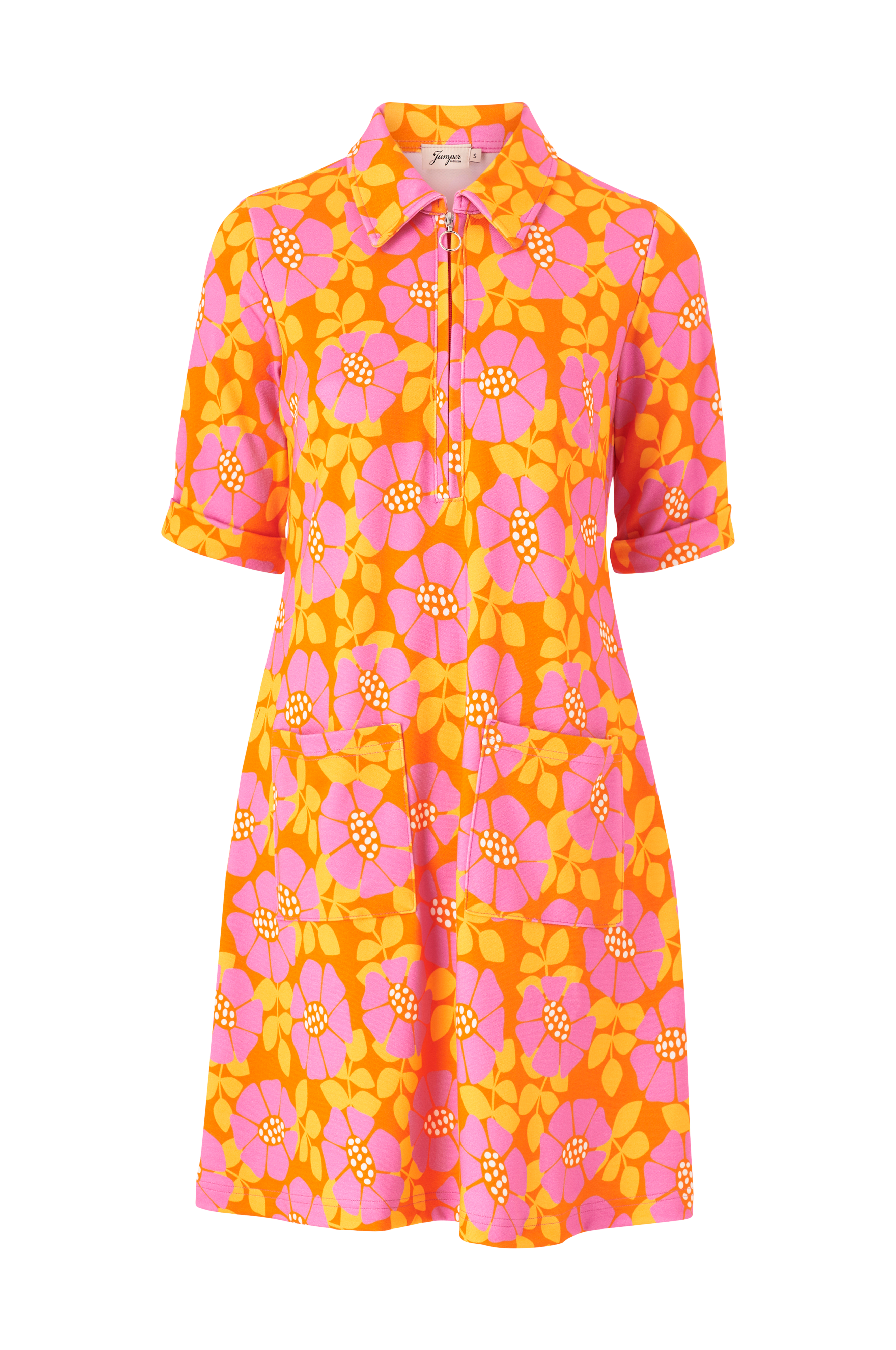 Kjole med retroinspireret mønster. Halvlang lynlås foran og korte ærmer med opslag. To påsyede lommer. Længde ca. 94 cm i str. S.