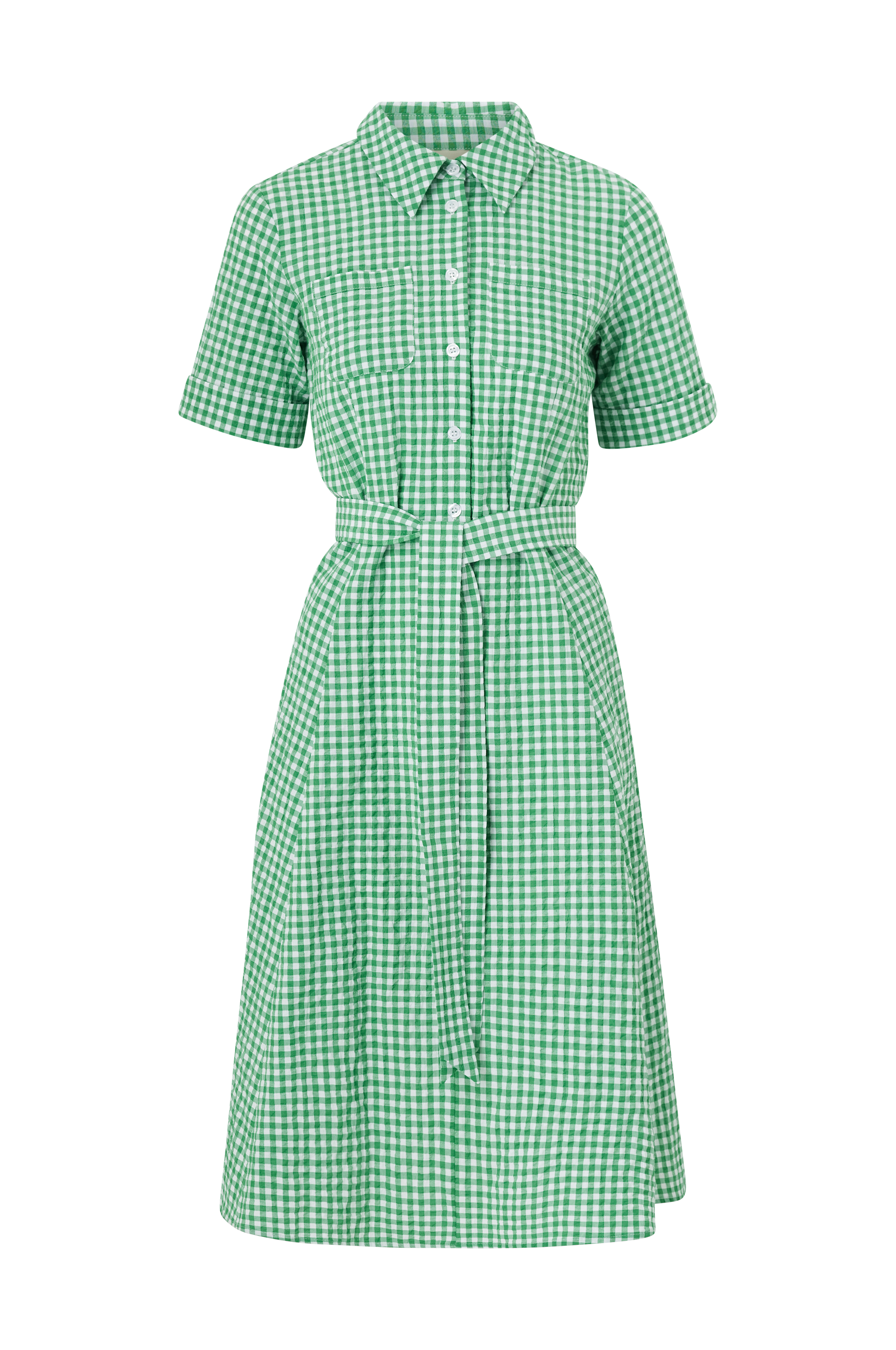 • Model med svaj i crepe• Skjortekrave• Knapper ned til hoften• Brystlommer• Kort ærme med oprullet• Indlagte sidelommer• Markeret talje med bindebælte• Vidde i nederdelen• Længde: 110 cm i størrelse 36
