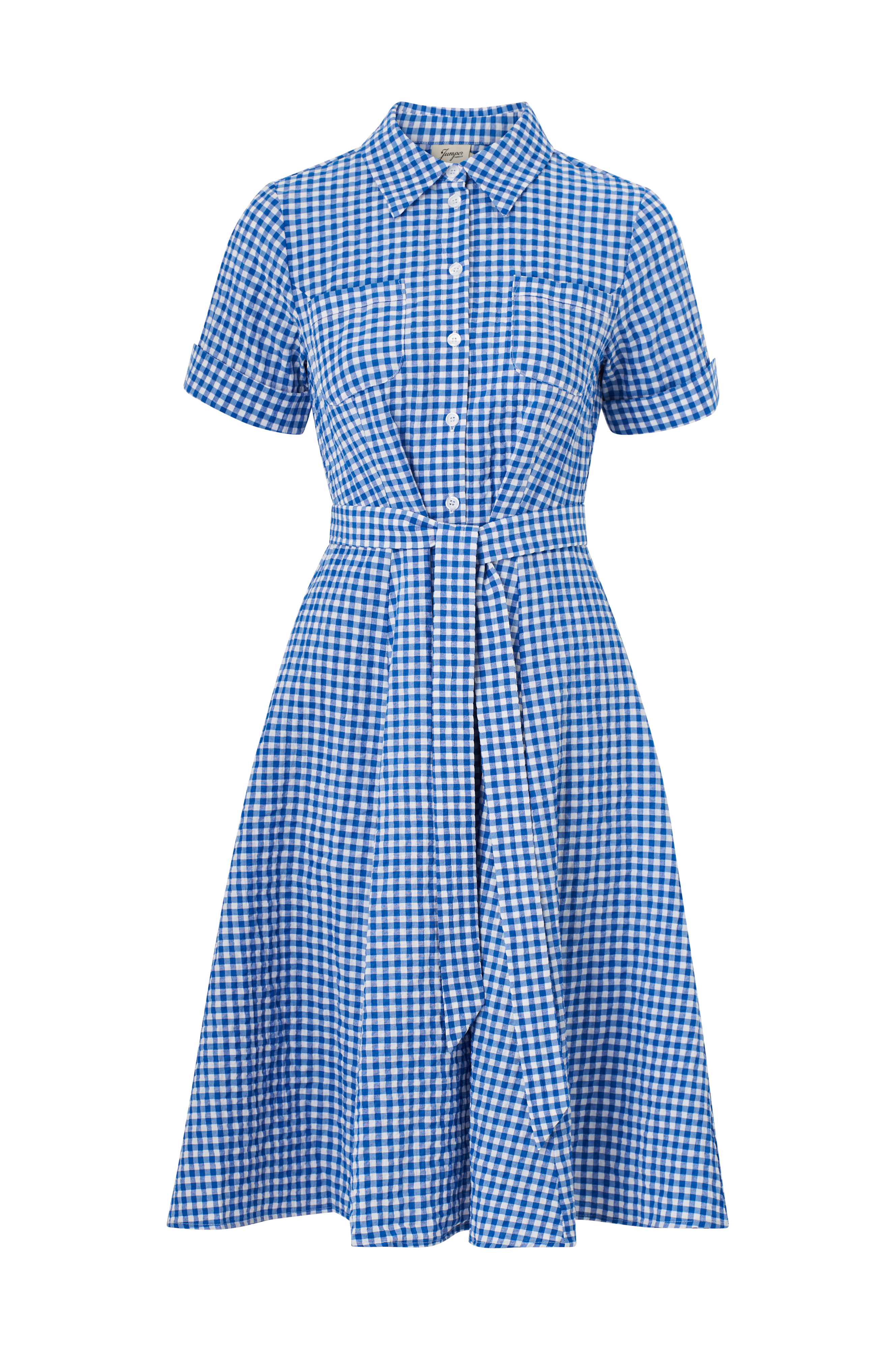 • Model med svaj i crepe• Skjortekrave• Knapper ned til hoften• Brystlommer• Kort ærme med oprullet• Indlagte sidelommer• Markeret talje med bindebælte• Vidde i nederdelen• Længde: 107 cm i størrelse 36