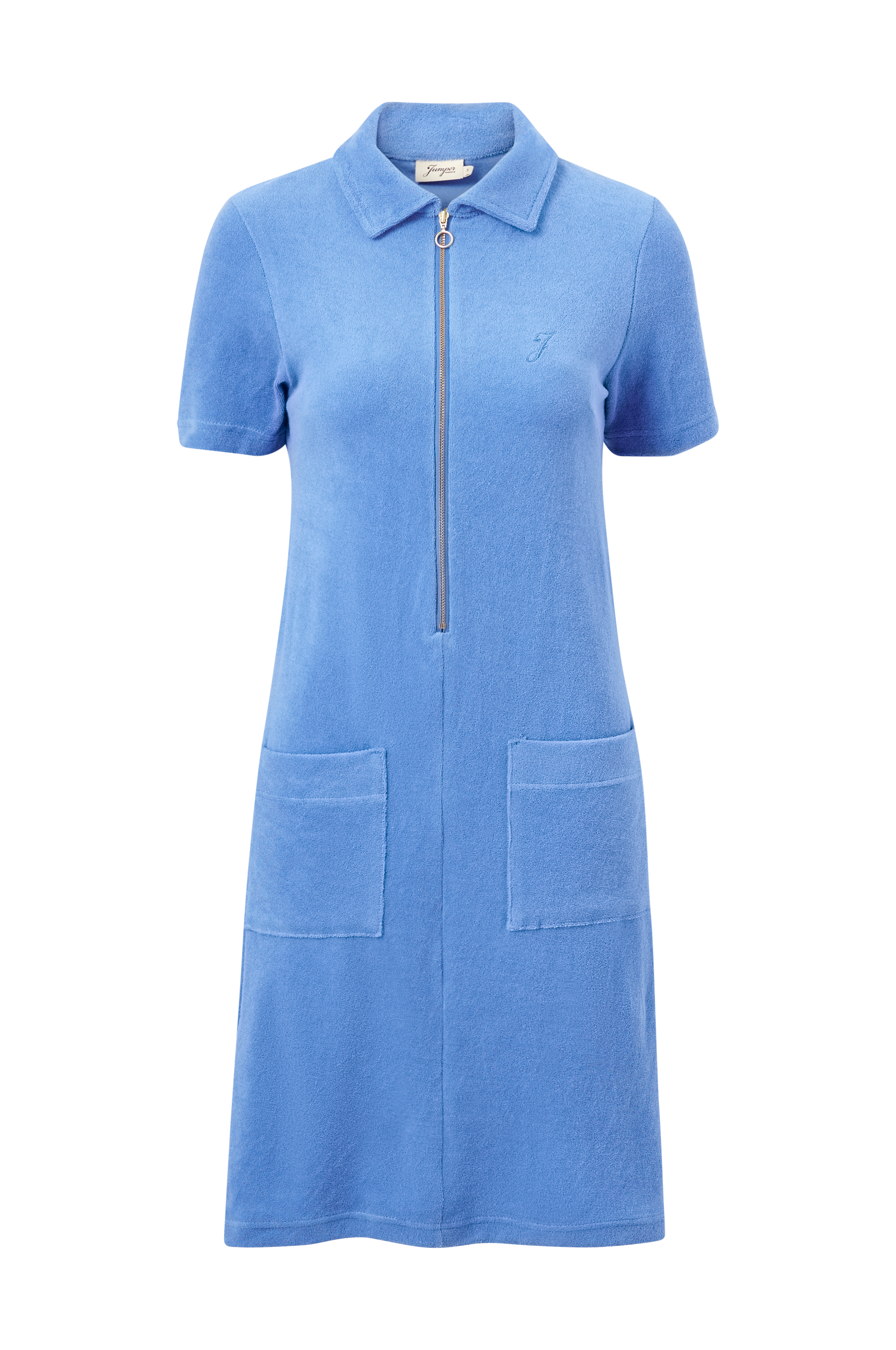 Jumperfabrikens klassiske frottékjole Lovisa med krave og synlig metallynlås foran. Korte ærmer og to påsyede lommer foran. Afslappet pasform som slutter lige over knæet. Længde ca. 97 cm i str. S.