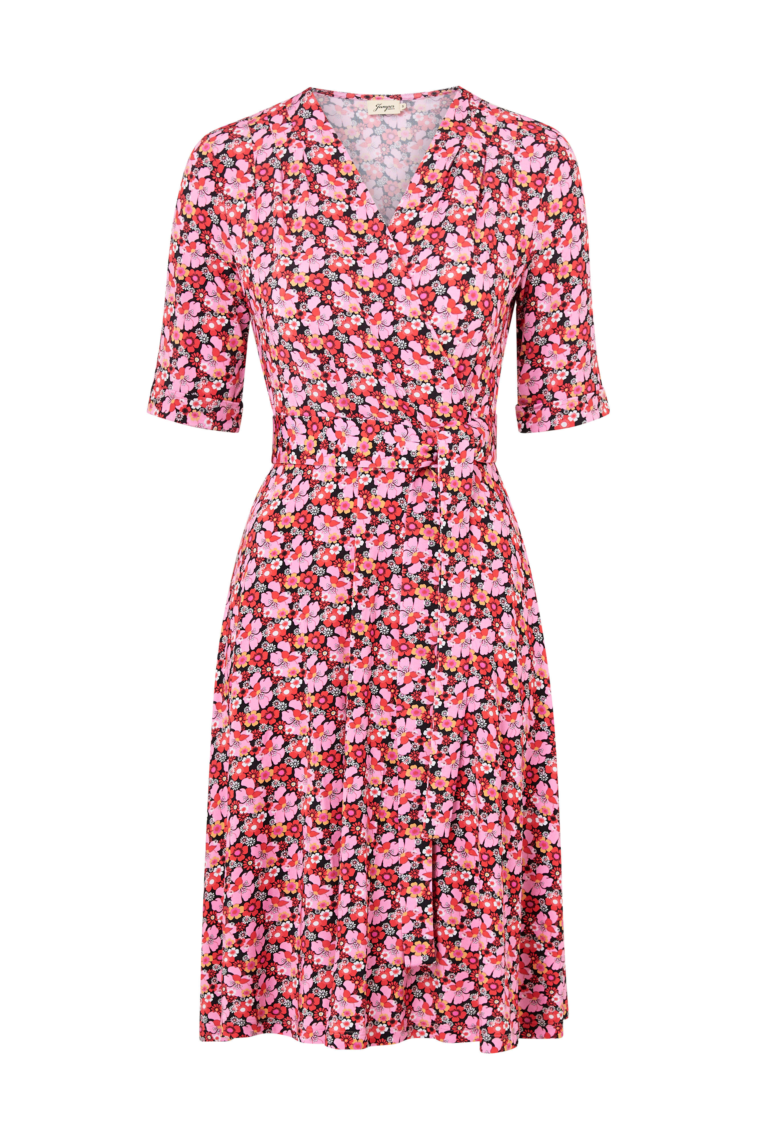 Blomstret kjole med overdel i slå-om og aftageligt bælte i taljen. Vid nederdel og ærme som slutter lige over albuen. Dekorative læg langs skuldersøm. Materialet har stretch og er en behagelig viskoseblanding som har et tungt og fint fald. Længde ca. 104 cm i str. S.