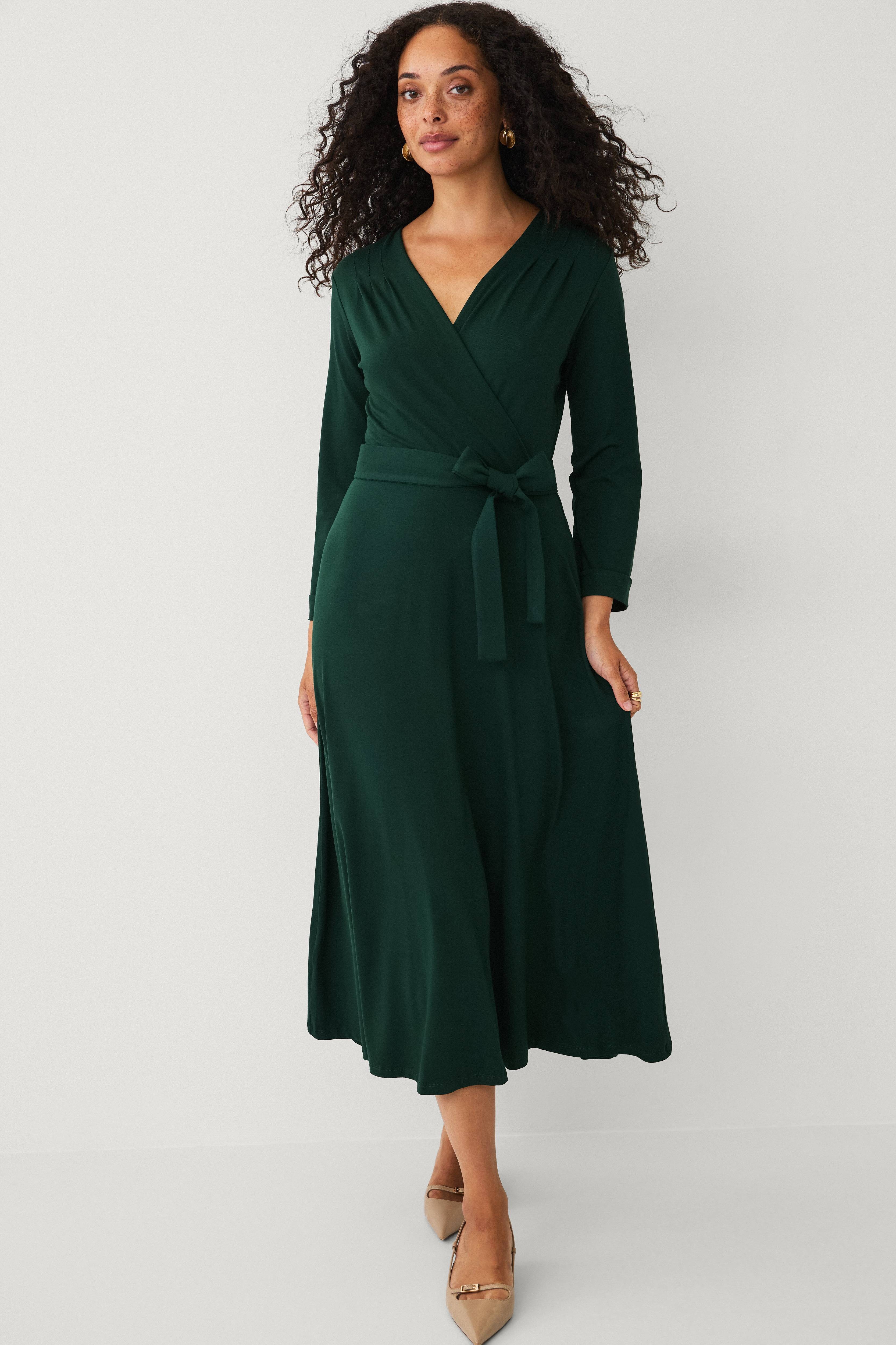 • Blød kjole i viskoseblanding • Slå-om design på toppen • 3/4 lange ærmer • Aftageligt bindebånd ved taljen • Bølgeformede detaljer på toppen • Nedre del med svaj • Længde: 127 cm i størrelse S