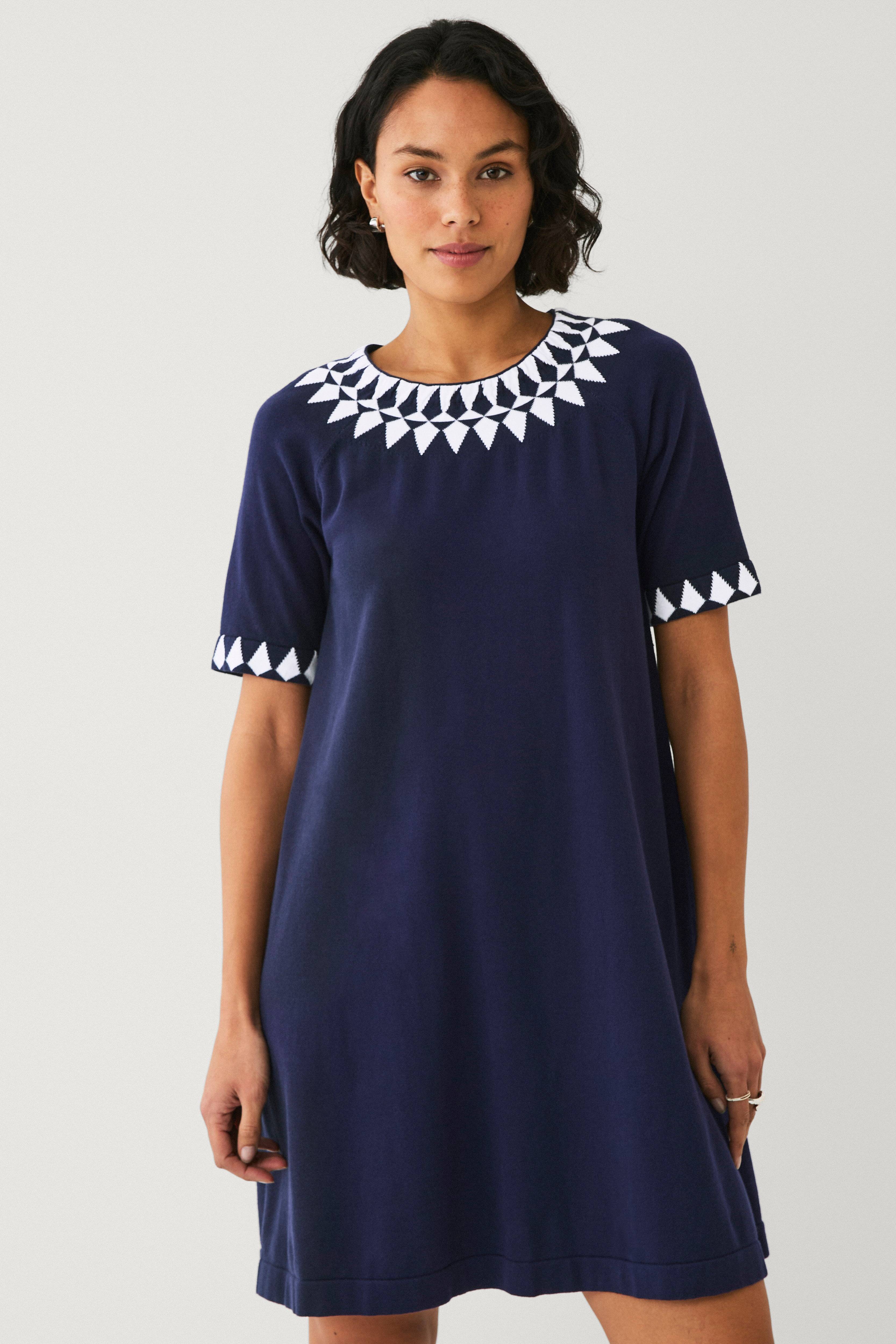 • Fintstrikket kjole i bomuld• Korte ærmer med nedsænkede skuldre• Afrundet halsudskæring• Mønsterstrikning på ærmerne og rundt om halsen• A-linje design• Knapstolpe i ryggen med dekorative knapper• Længde: 96 cm i størrelse S