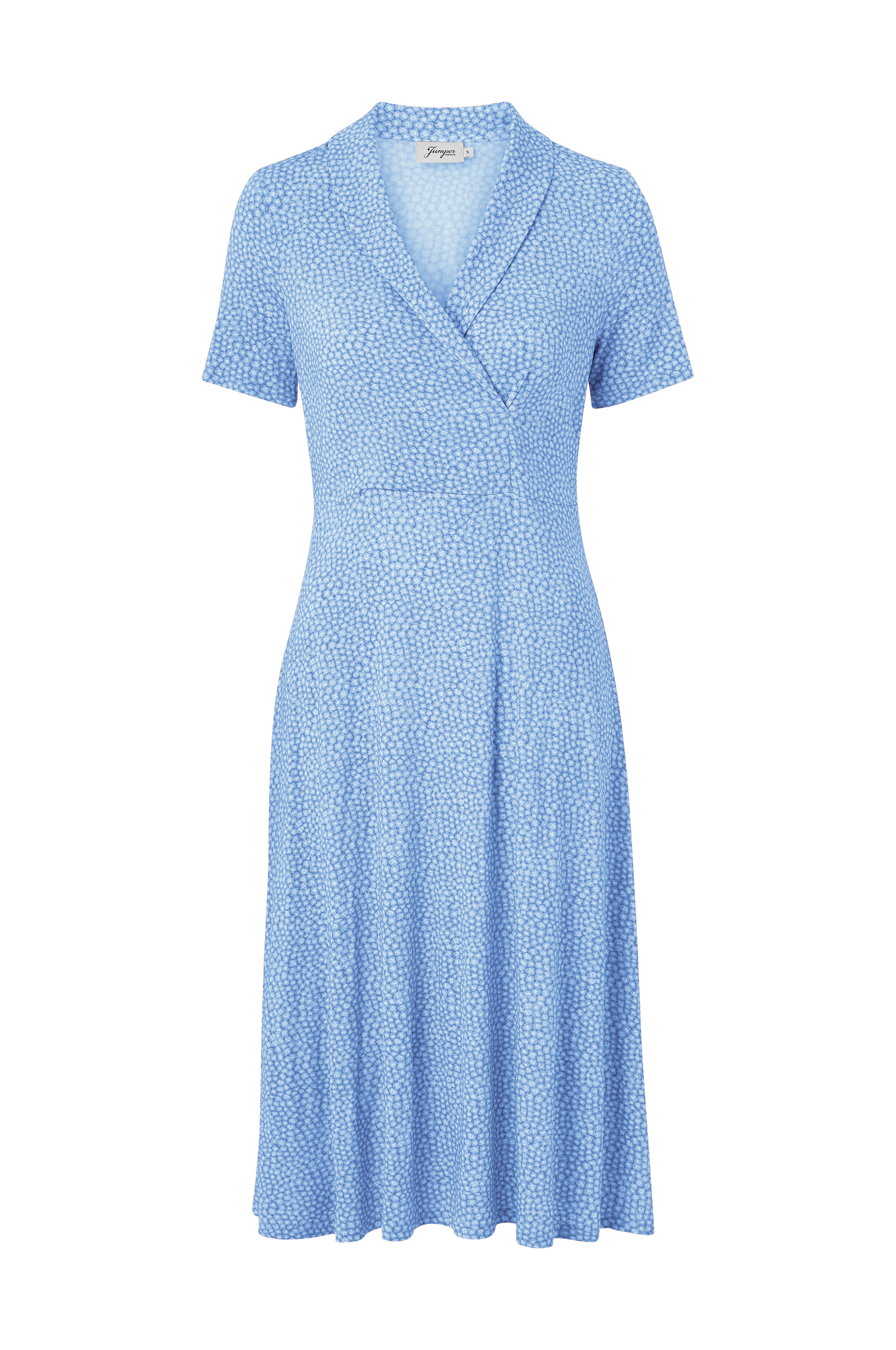 • Figurformede model i jersey• Slå-om på toppen• Sjalskrage• Kort ærme• Markeret talje• Nederdel med svaj• Længde: 111 cm i størrelse S