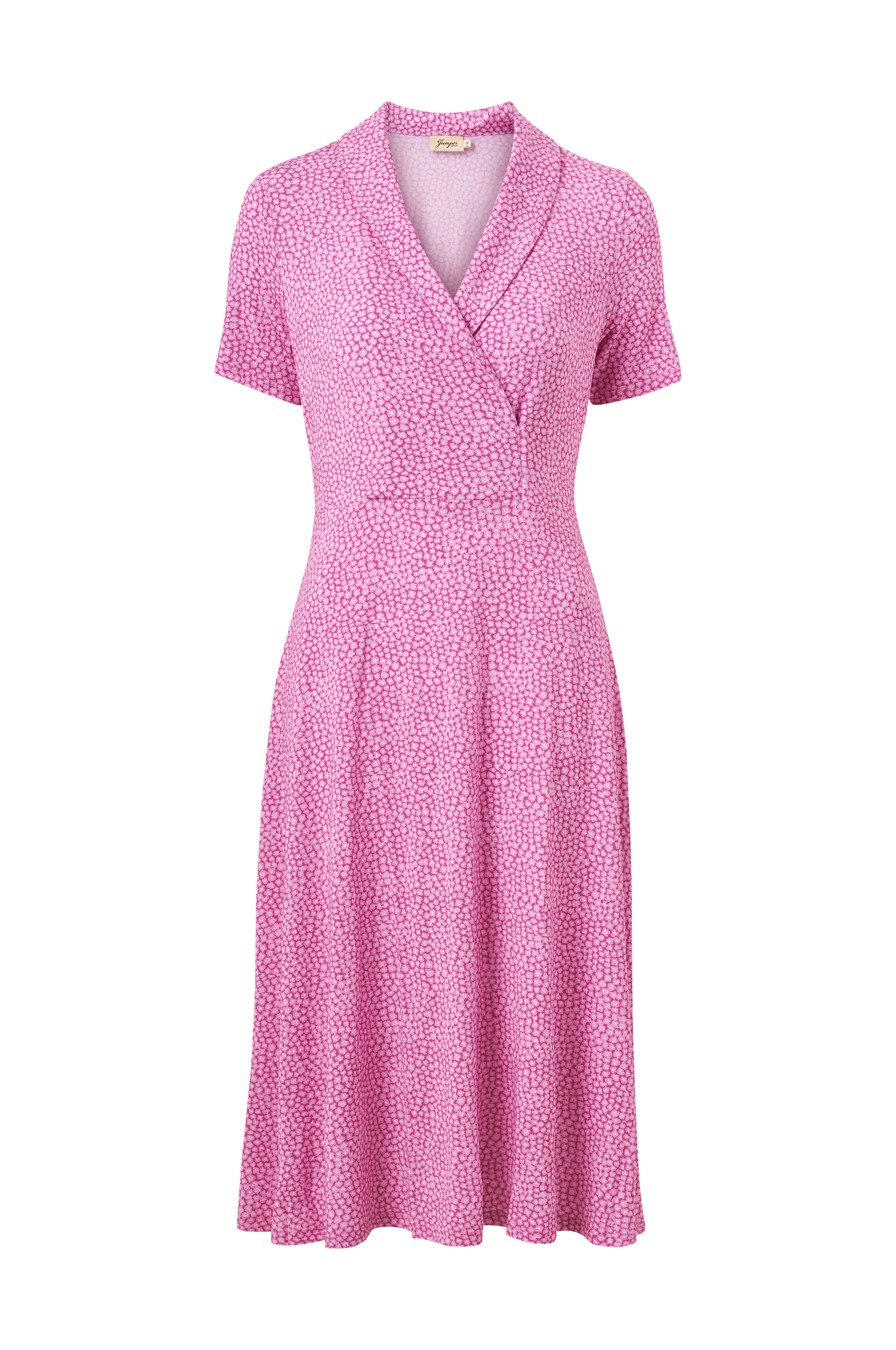 Blomstret kjole i behagelig, noget tungere viskose som giver fint fald. Kjolen har korte ærmer, slå-om med snit i taljen og en lille, fin sjalskrave. Nederdelen er lang og vid og sluttet lige under knæet. Længde ca. 115 cm i str. S.
