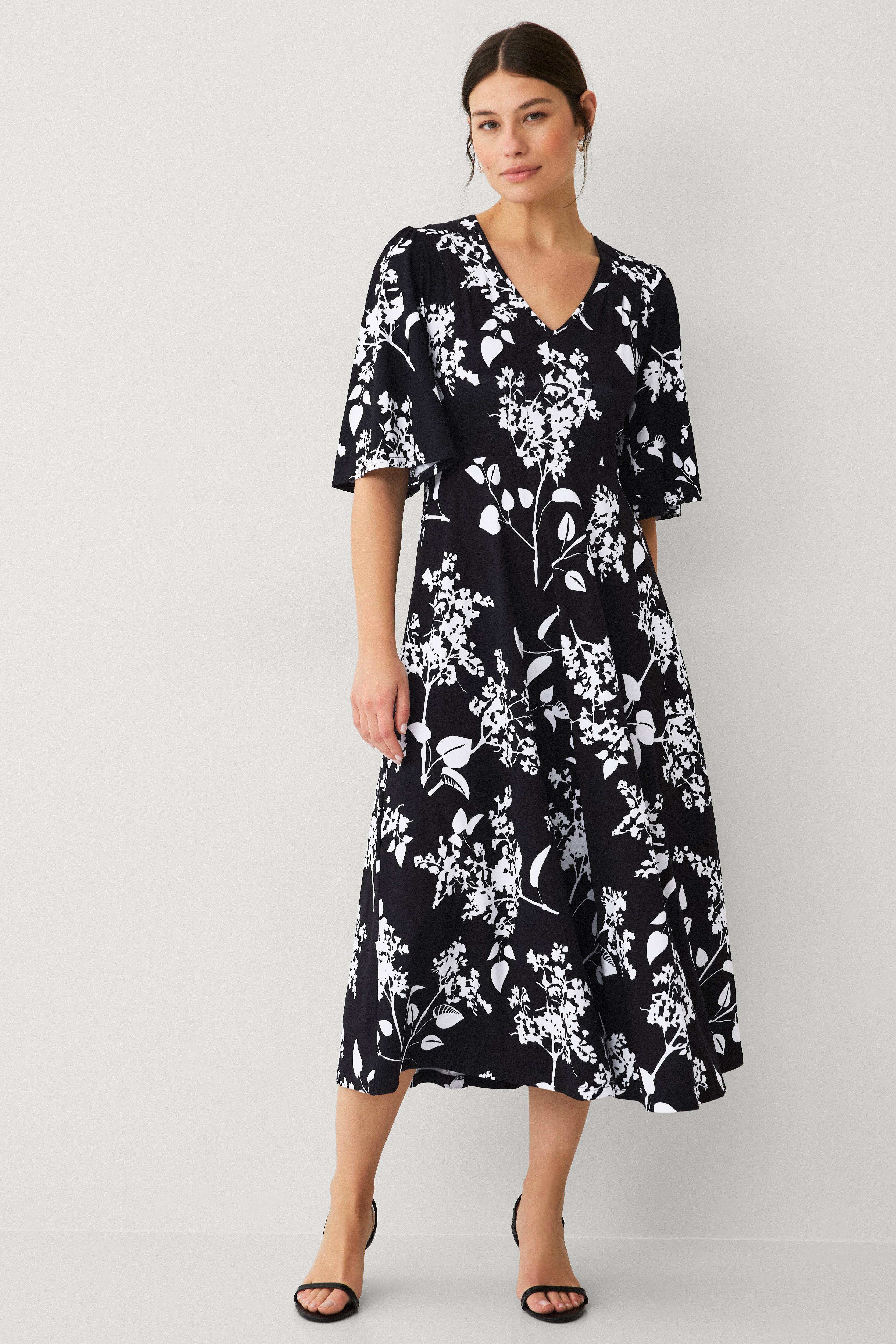 En kjole med et smukt blomstermønster. Materialet er en elastisk og behagelig viskoseblanding, som har et tungt og smukt fald. Kjolen har et klokkeformet skørt og ærmer, der slutter ved albuen. Der er smukke dekorative læg langs skuldersømmene og ved skørtet. Dette er en længere kjole, der når til læggen.
