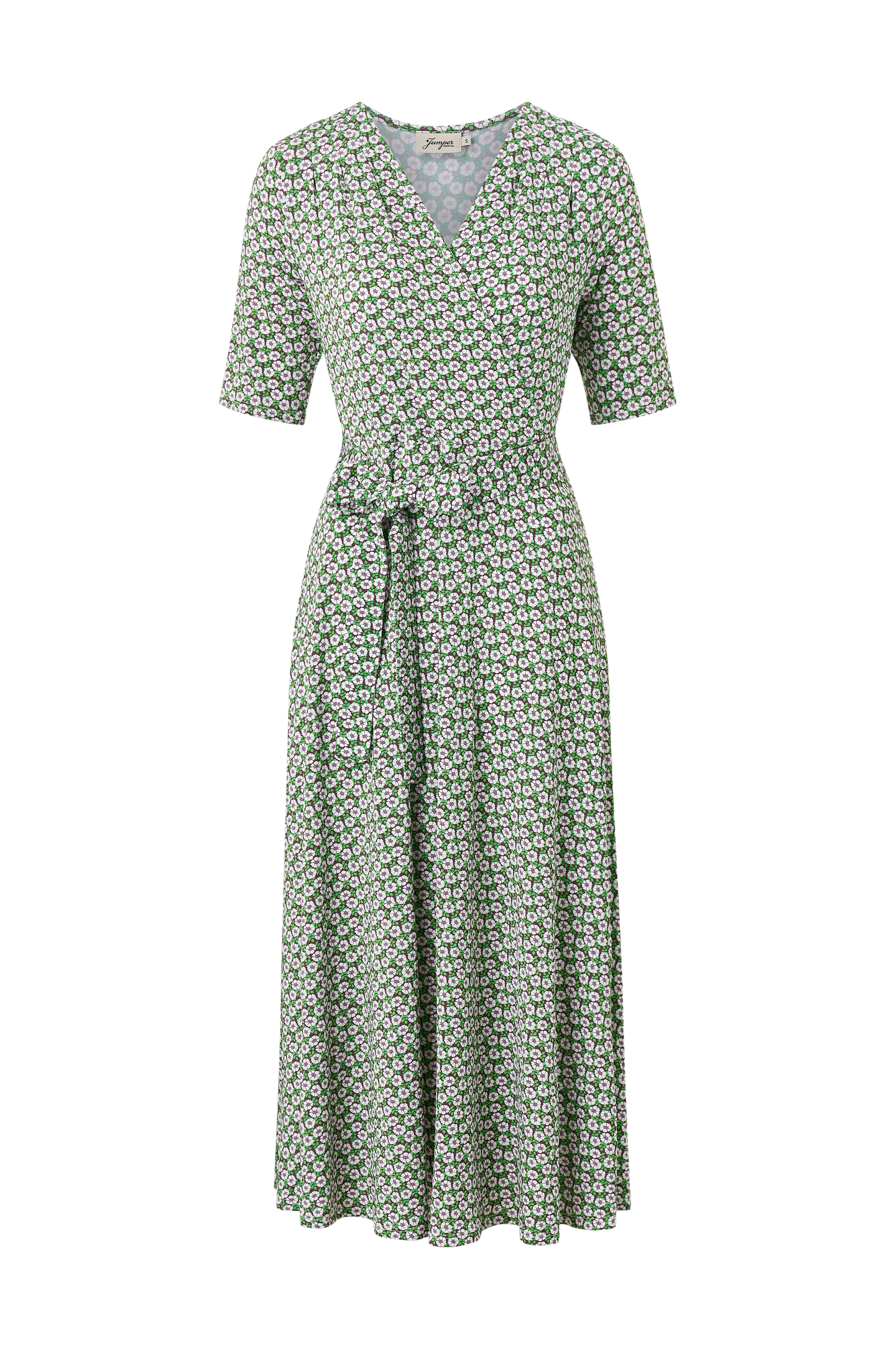 • Lang, elastisk kjole med korte ærmer• V-formet halsudskæring med slå-om design• Syede lægge oppe foran• Aftageligt bindebælte ved taljen• Længde: 131 cm i størrelse S