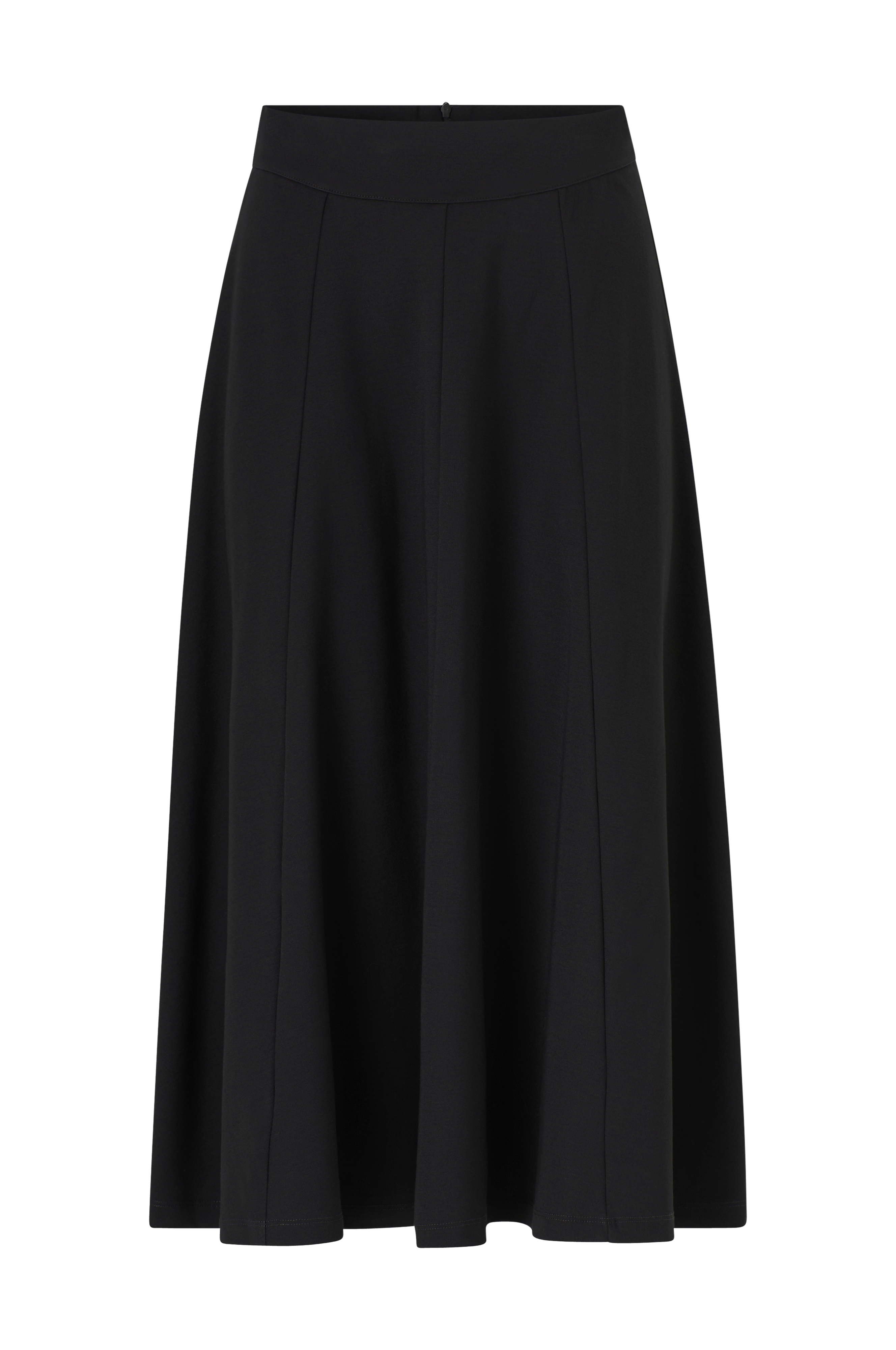 • Bred model med svaj i jersey• Påsyet linning med lynlås bagpå• Vertikale sømme• Længde: 80 cm i størrelse S