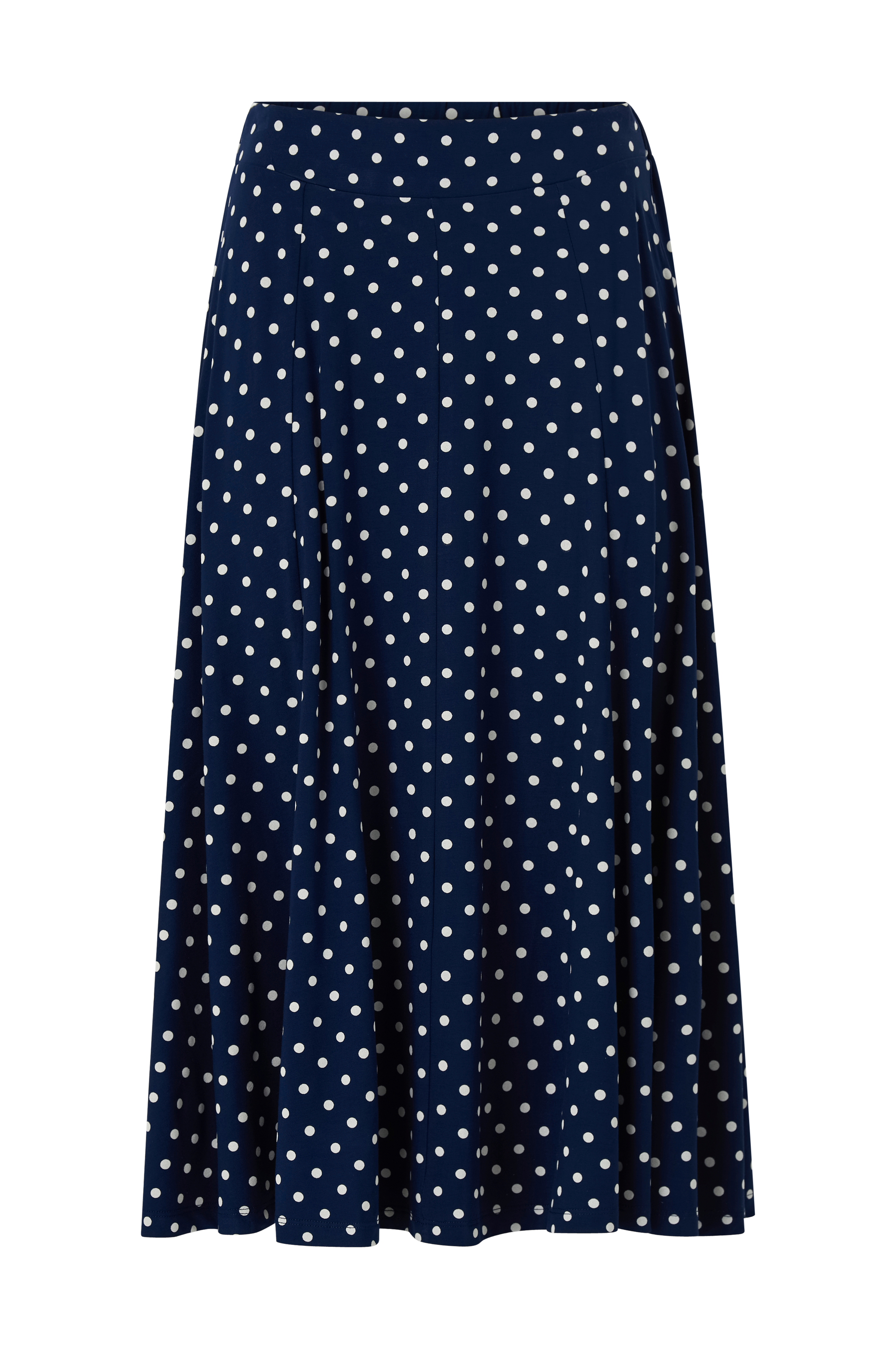 En nederdel med et klassisk polkaprikket mønster. Fremstillet af elastisk viskose med et tungt og elegant fald. Nederdelen har en A-formet silhuet og elastik i taljen.