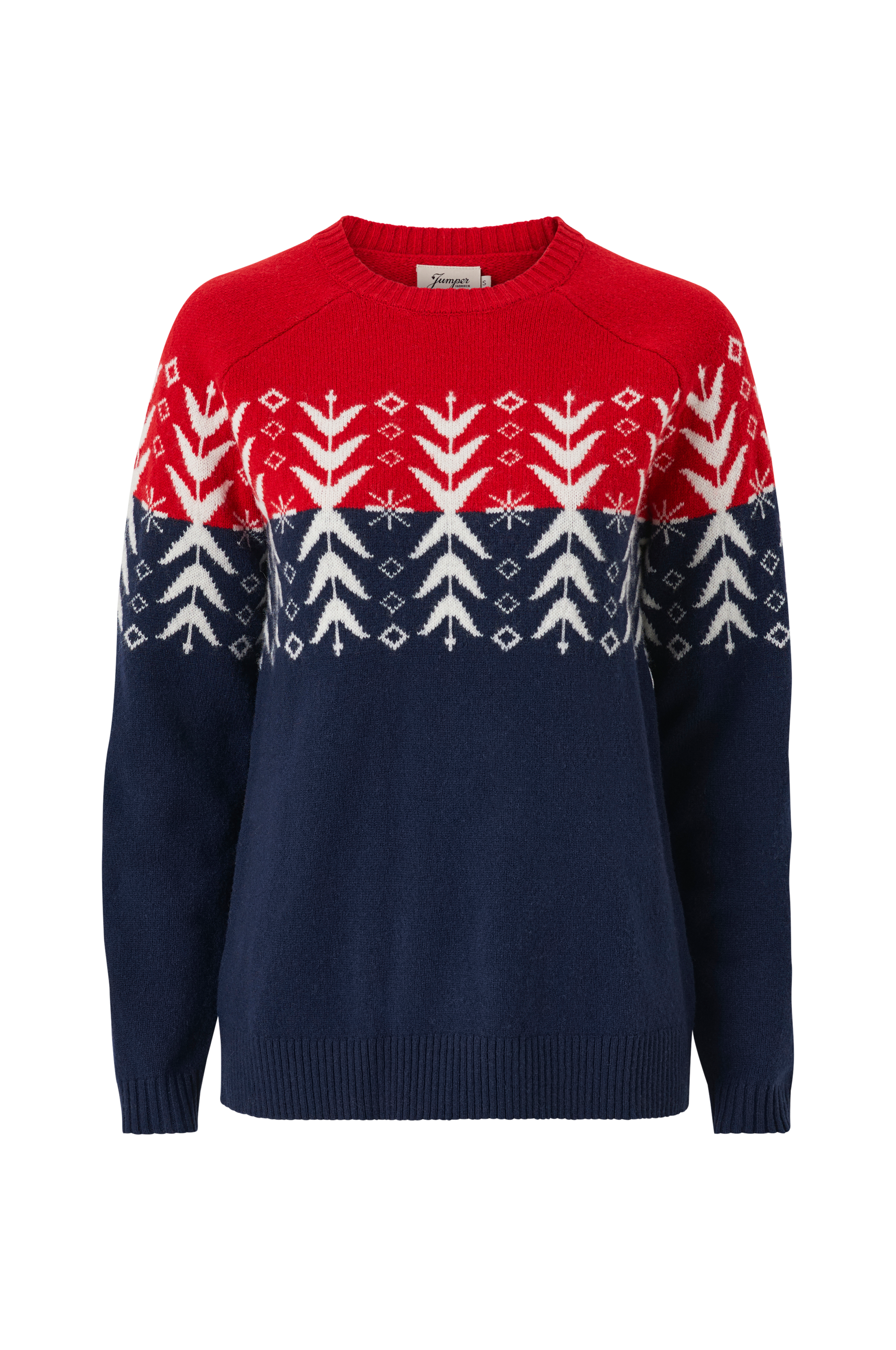 • Mønsterstrikket model• Rund hals med ribkant• Langt raglanærme• Ribstrik ved manchetterne og ved nederste kant