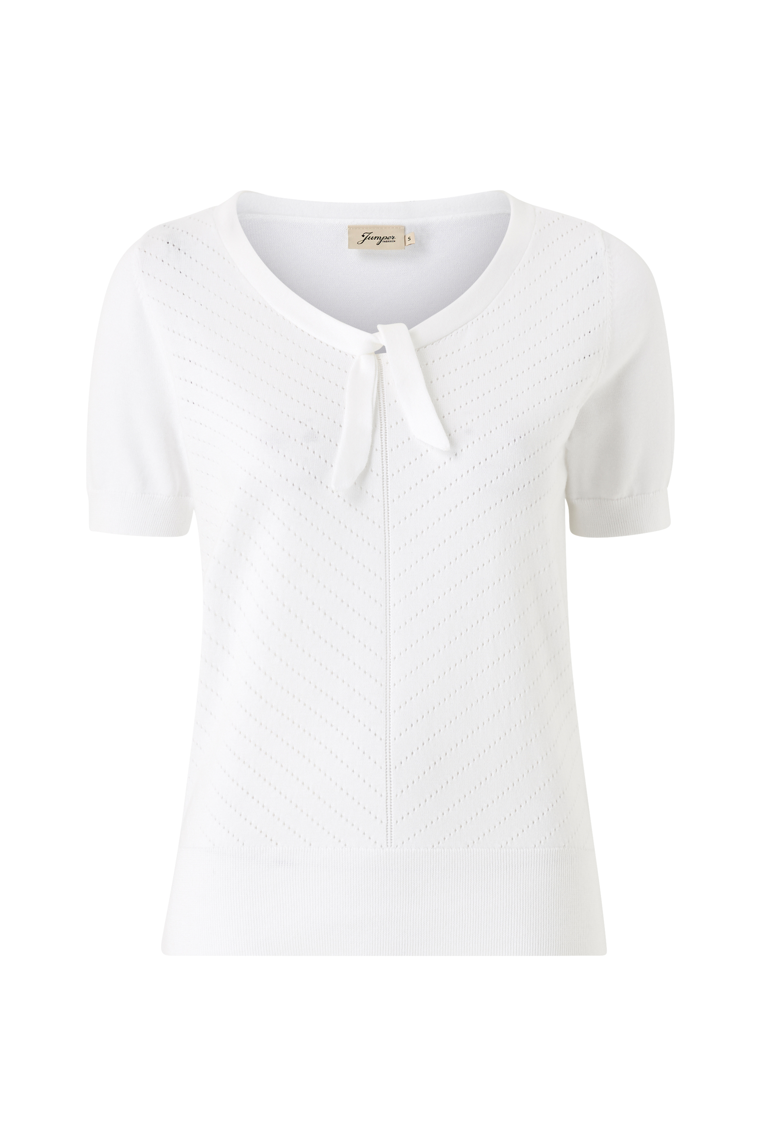 • Korte ærmer• Snøring på udskæringen• Fintstrikket kvalitet• Hulmønster foran
