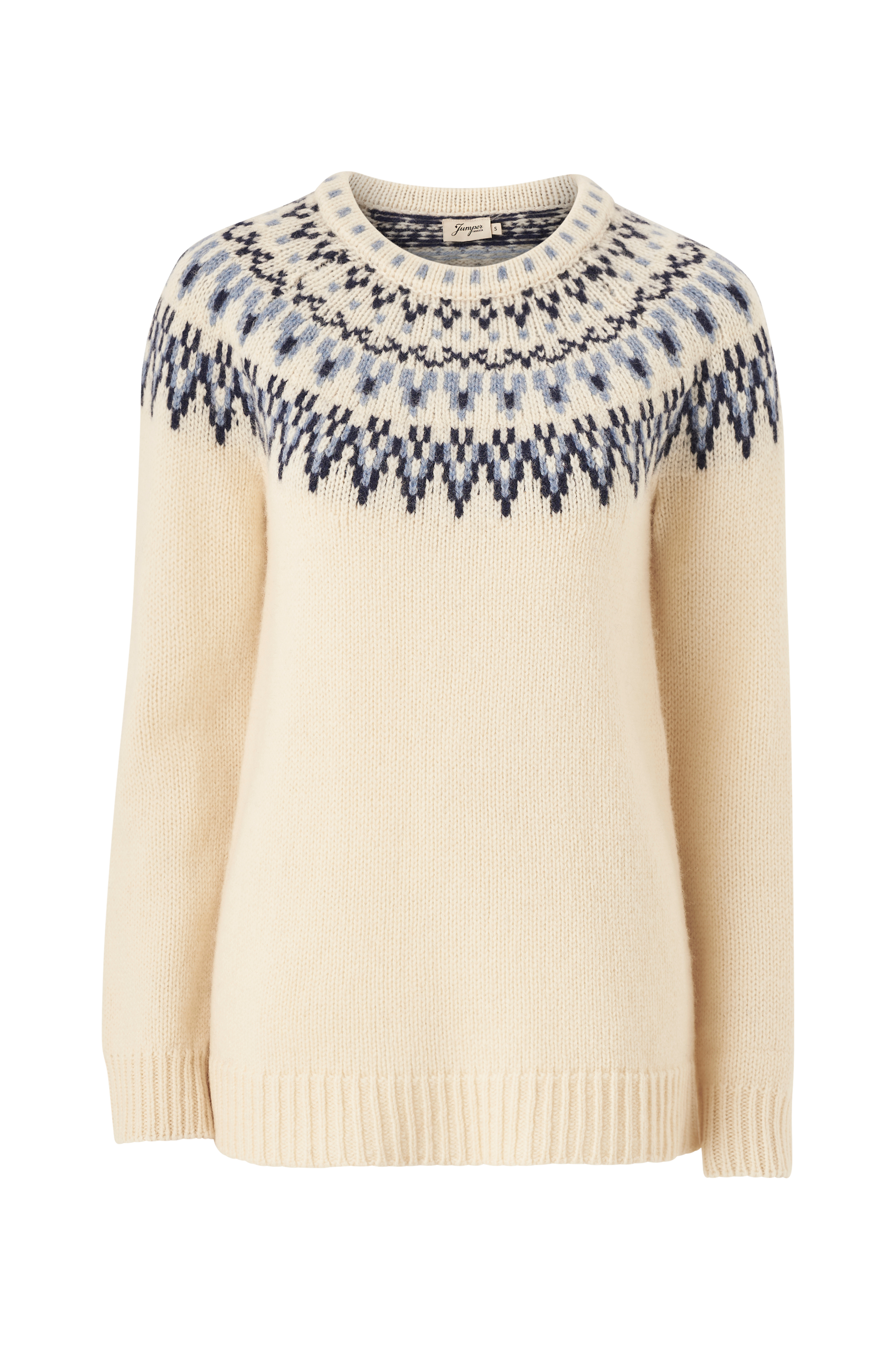 • Lige model• Afrundet mønsterstrikning på toppen• Rund hals• Langt raglanærme• Ribstrik ved manchetterne og nederst