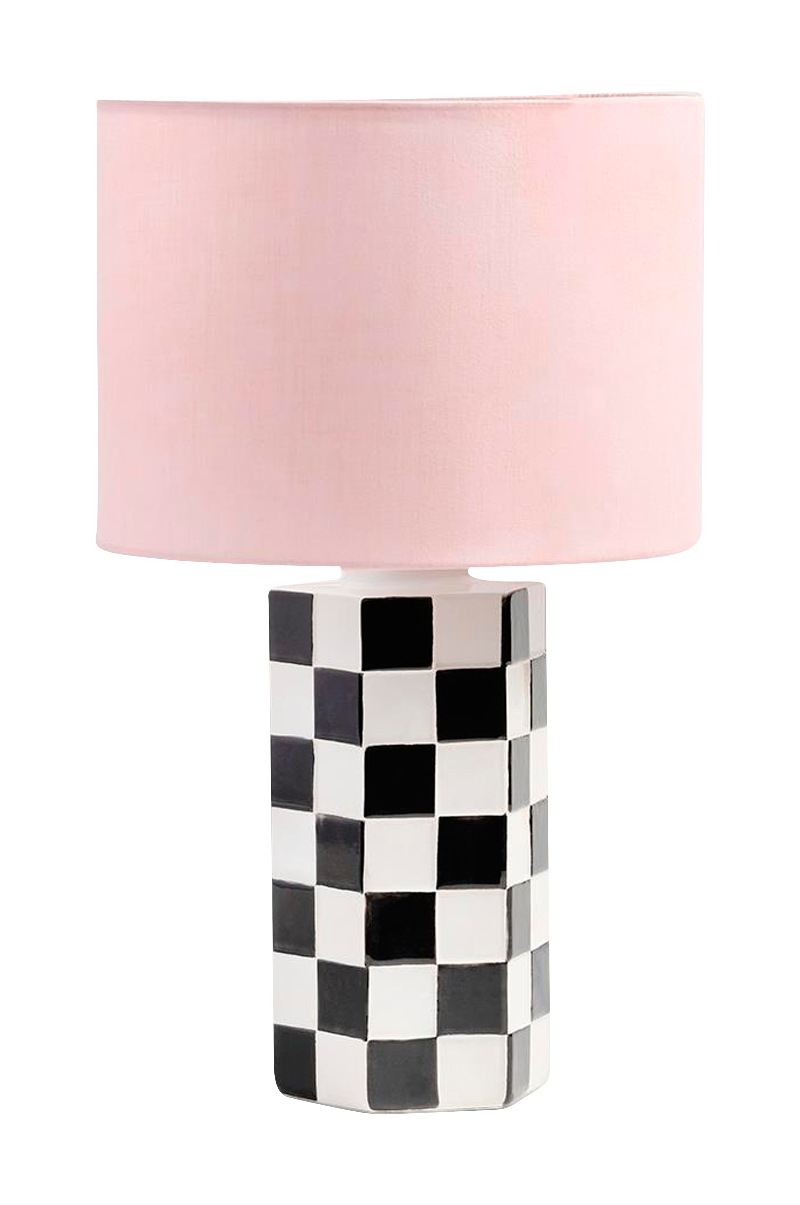 Denne lampe, med en fod med tern og lampeskærm i en fed farve, giver din stue eller kontor en original stil. Til stor sokkel (E27). Støves af. Fremstillet af stentøj. Skærm i bomuld.