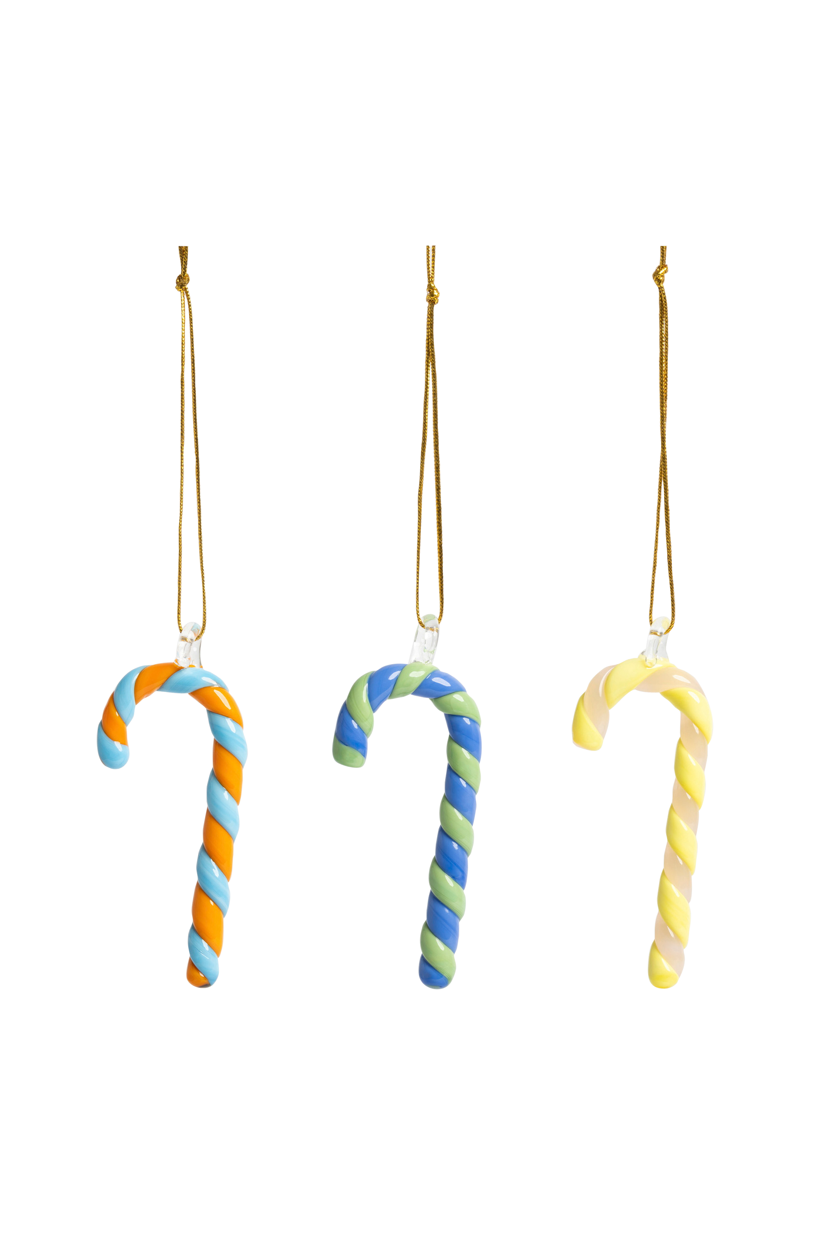 Ornament Candy cane sæt med 3, fremstillet af sodavandsglas. Tørres af med en fugtig klud til rengøring.