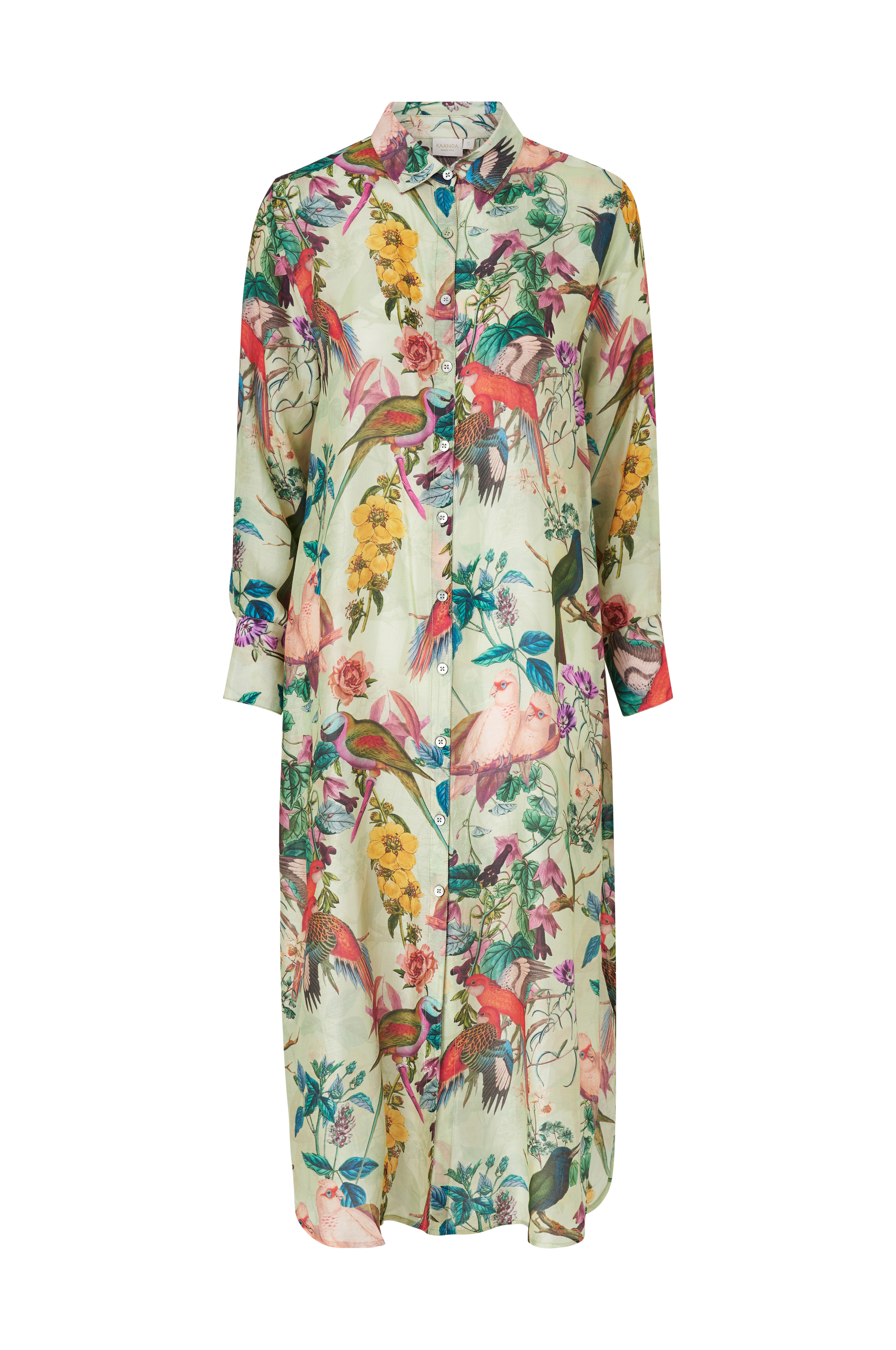 • Skjortekjole med lille krave• Knapper hele vejen frem• Langt ærme med manchet og indvendig flap• Afrundede slidser nede i siderne• Længde: 123 cm i størrelse S