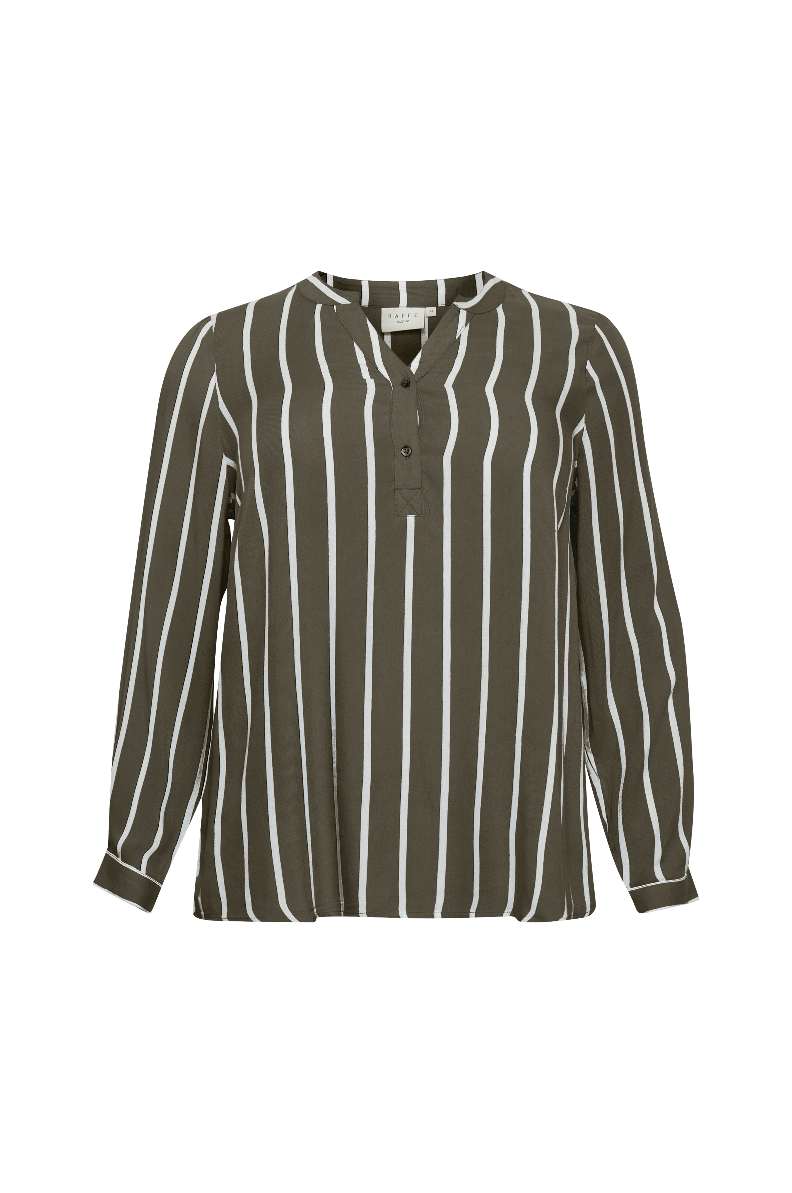 Bluse i fin, vævet viskose. V-udskæring med knapper foran og lange ærmer som kan rulles op og fastgøres med tamp og knap.
