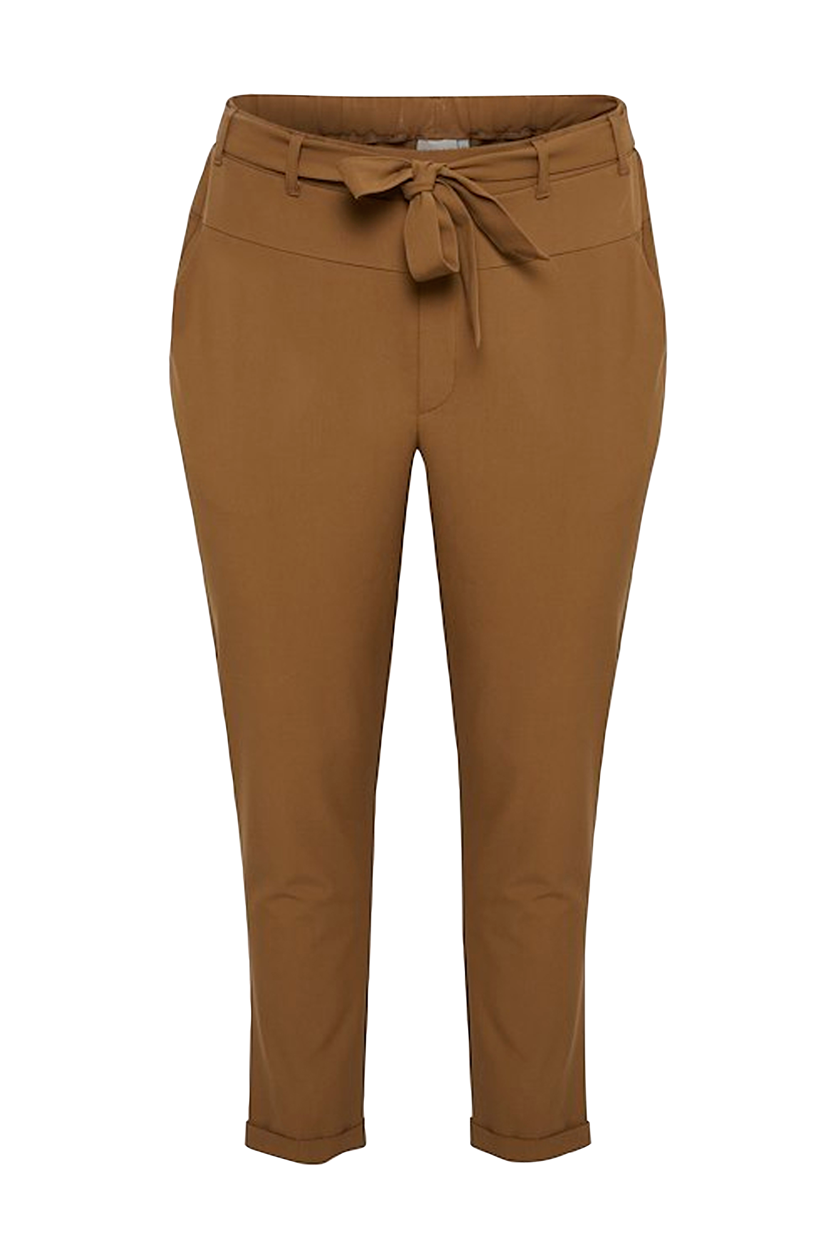 Bukser kcJia Belt Pants fra Kaffe Curve med vævet forside og bagside i stretchjersey. Strukturblandingen giver diskret farvevariation. Pull-on-model med rynket elastik bagpå og bindebælte rundt om. Lommer i siderne og opslag i benkant. Pyntelommer bagpå. Benlængde ca. 72 cm i str. 44.