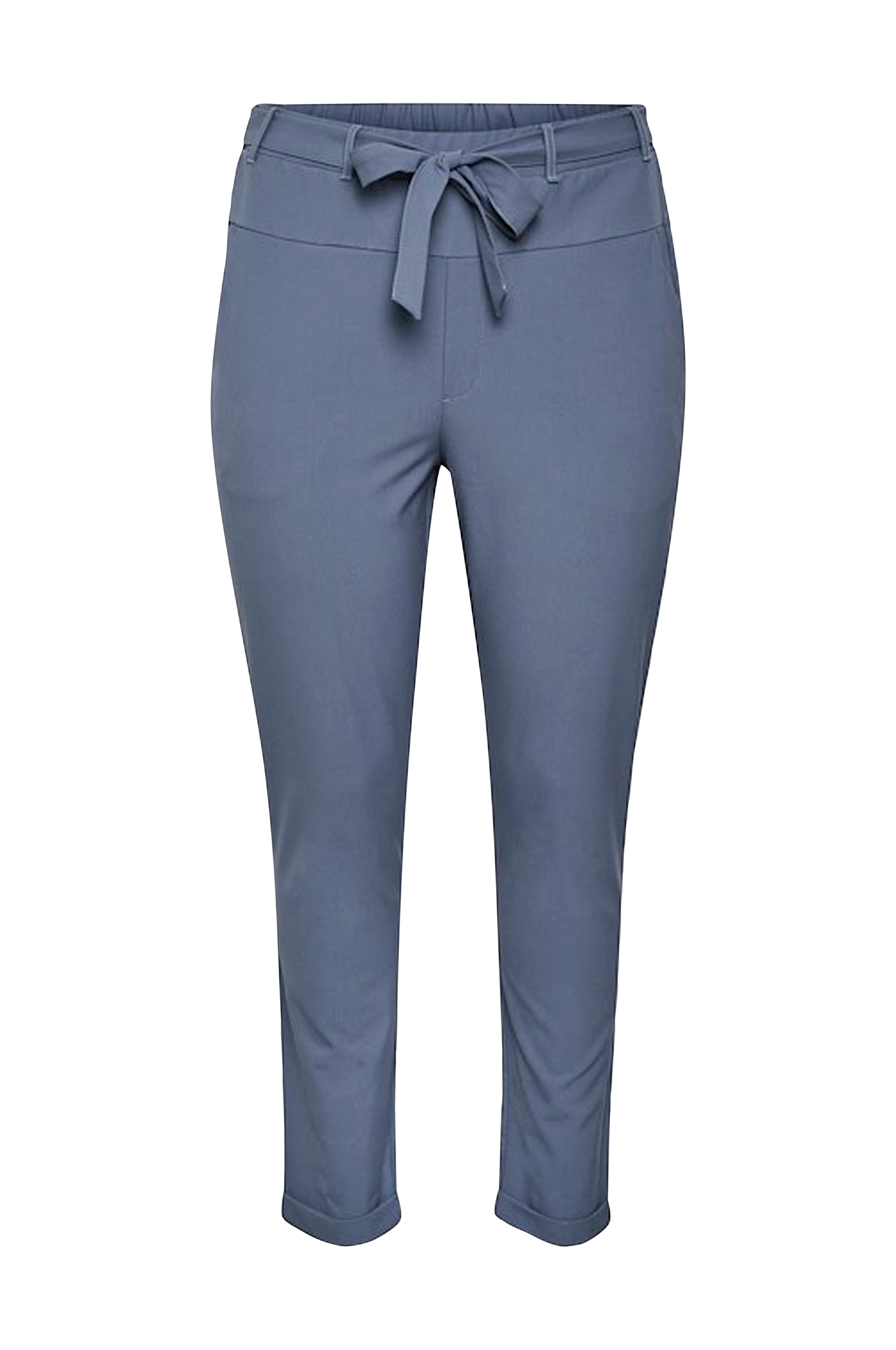 Bukser kcJia Belt Pants fra Kaffe Curve med vævet forside og bagside i stretchjersey. Strukturblandingen giver diskret farvevariation. Pull-on-model med rynket elastik bagpå og bindebælte rundt om. Lommer i siderne og opslag i benkant. Pyntelommer bagpå. Benlængde ca. 72 cm i str. 44.
