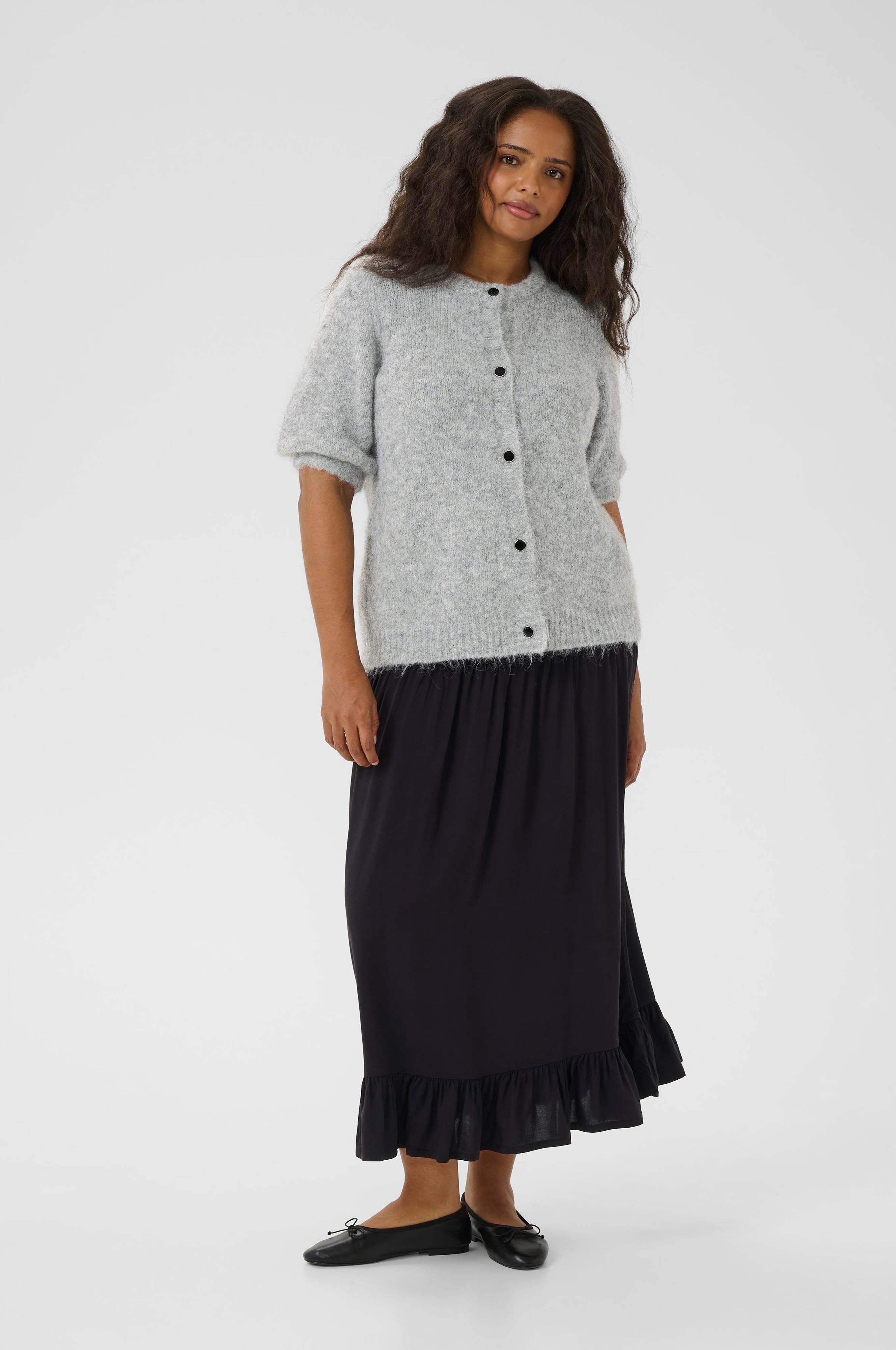 • Kortærmet, strikket cardigan• Rund, ribbet halsudskæring• Glatte knapper foran• Ribmanchetter ved manchetterne og ved nederste kant• Plusstørrelser