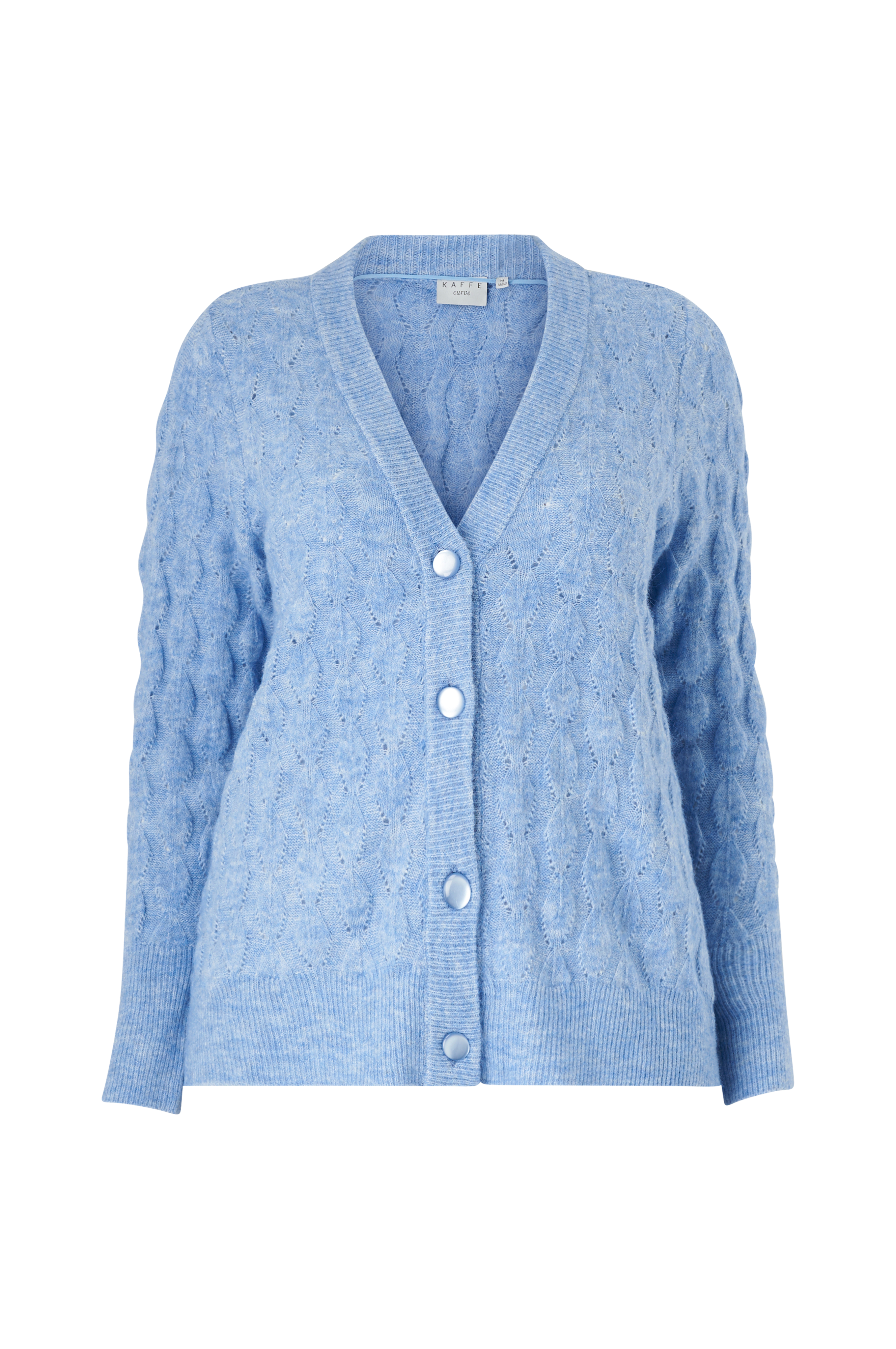 • Store størrelser• Mønsterstrikket model• V-formet halsudskæring• Store knapper foran• Ribstrikkede kanter