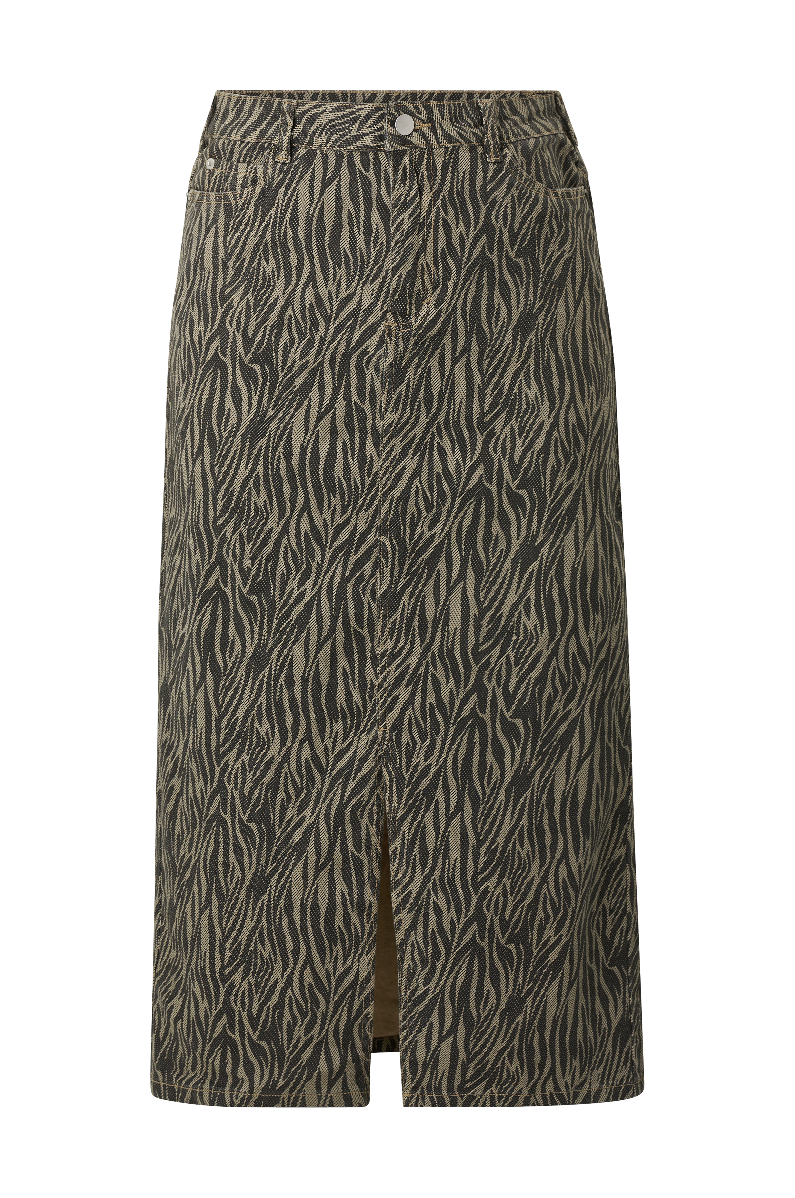 • Nederdel i denim med et zebramu00f8nster• Femlommemodel• Mediumhøj talje• Bælteløkker• Lynlås- og knaplukning• Slids nede foran• Normal pasform• Store størrelser• Længde: 91 cm i størrelse 36