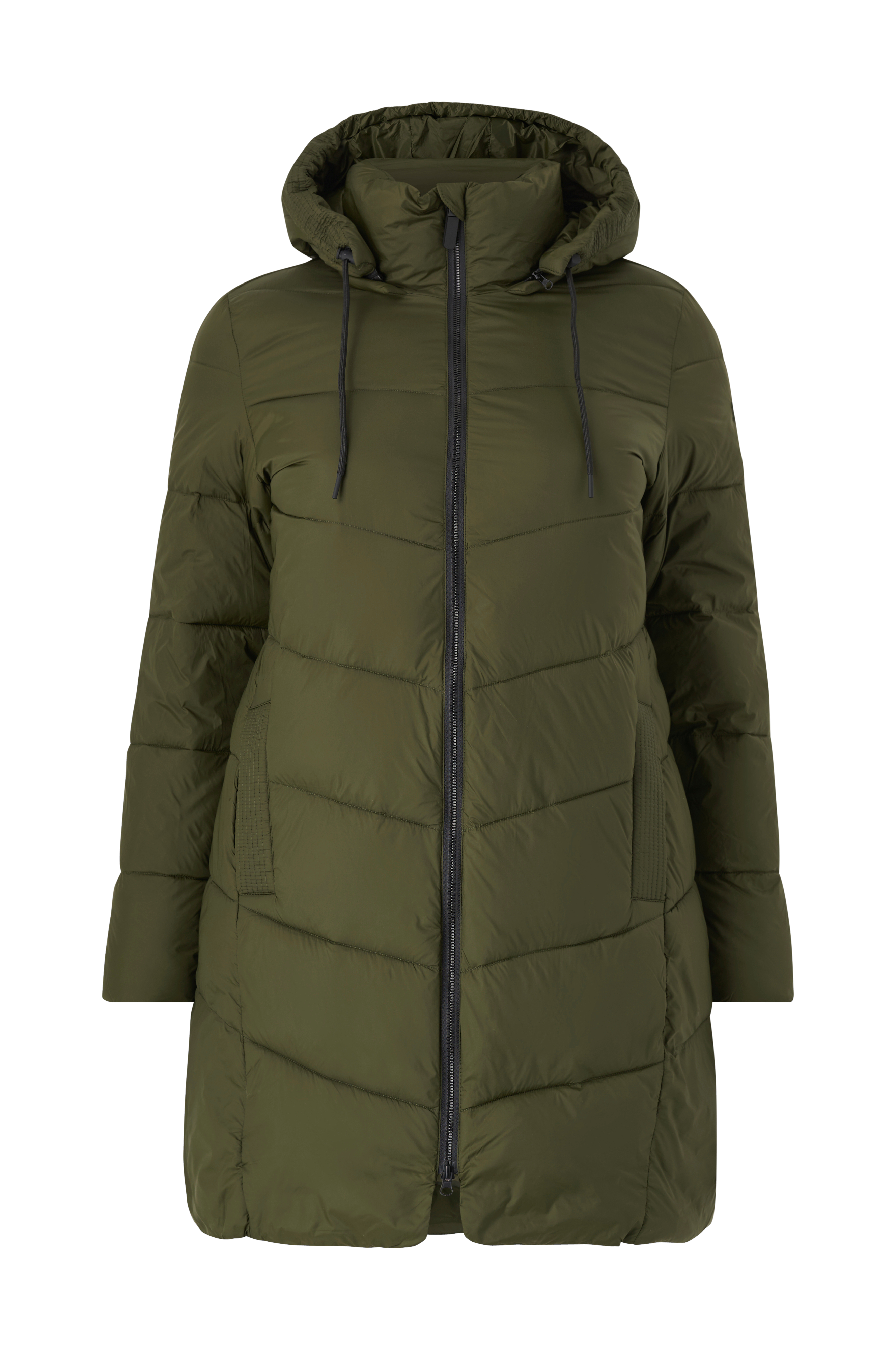 • Quiltet, foret frakke• Aftagelig hætte med træksnørre• To-vejs lynlås• To lommer• Elastik ved manchetterne• Store størrelser• Længde: 90 cm i størrelse 44