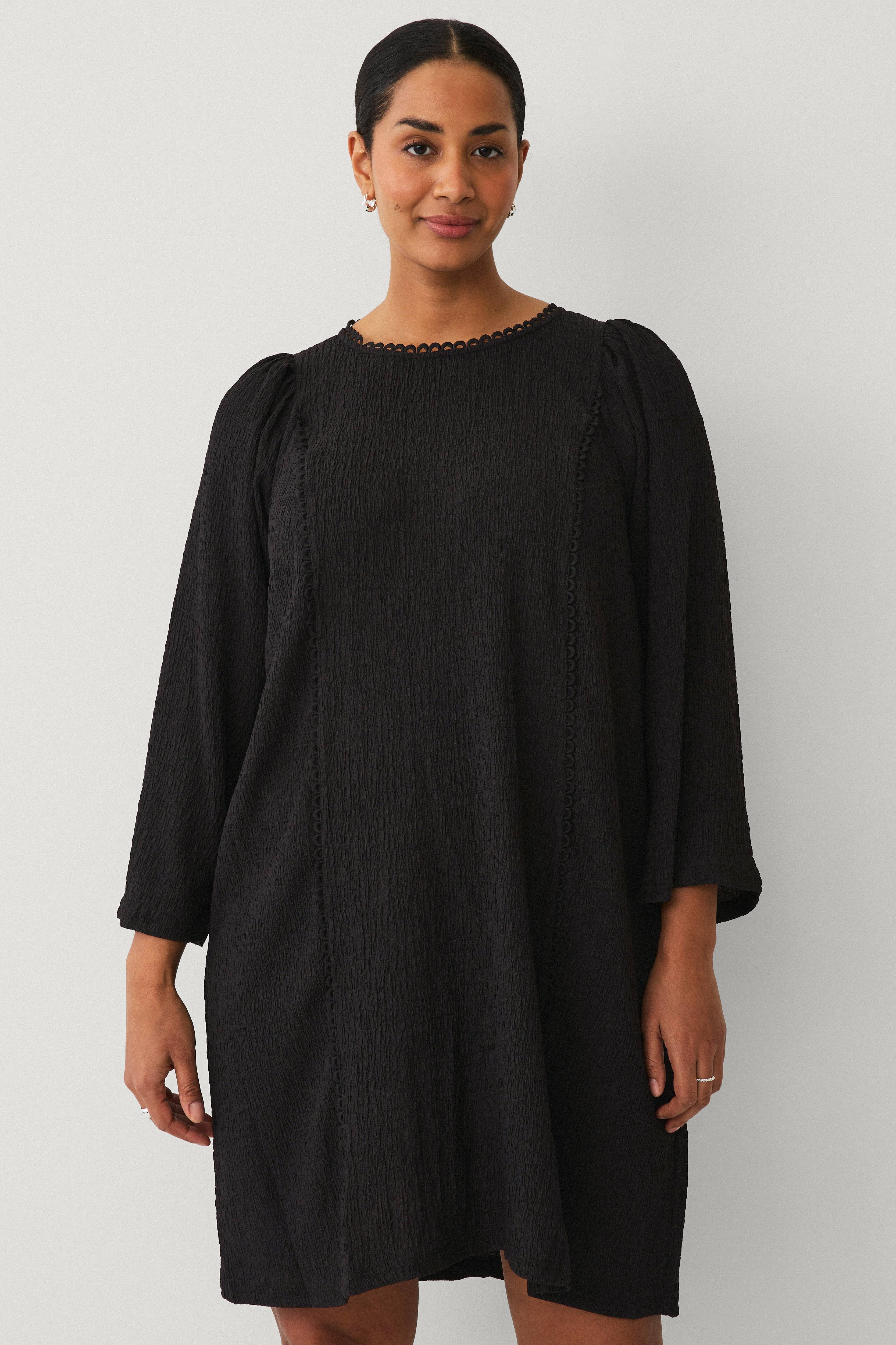 • Store størrelser• Elastisk model med svaj• Rund hals med blondekant og knap i nakken• Bredt ballonærme• Vertikal blonde foran og bagpå• Længde: 97 cm i størrelse 42/44