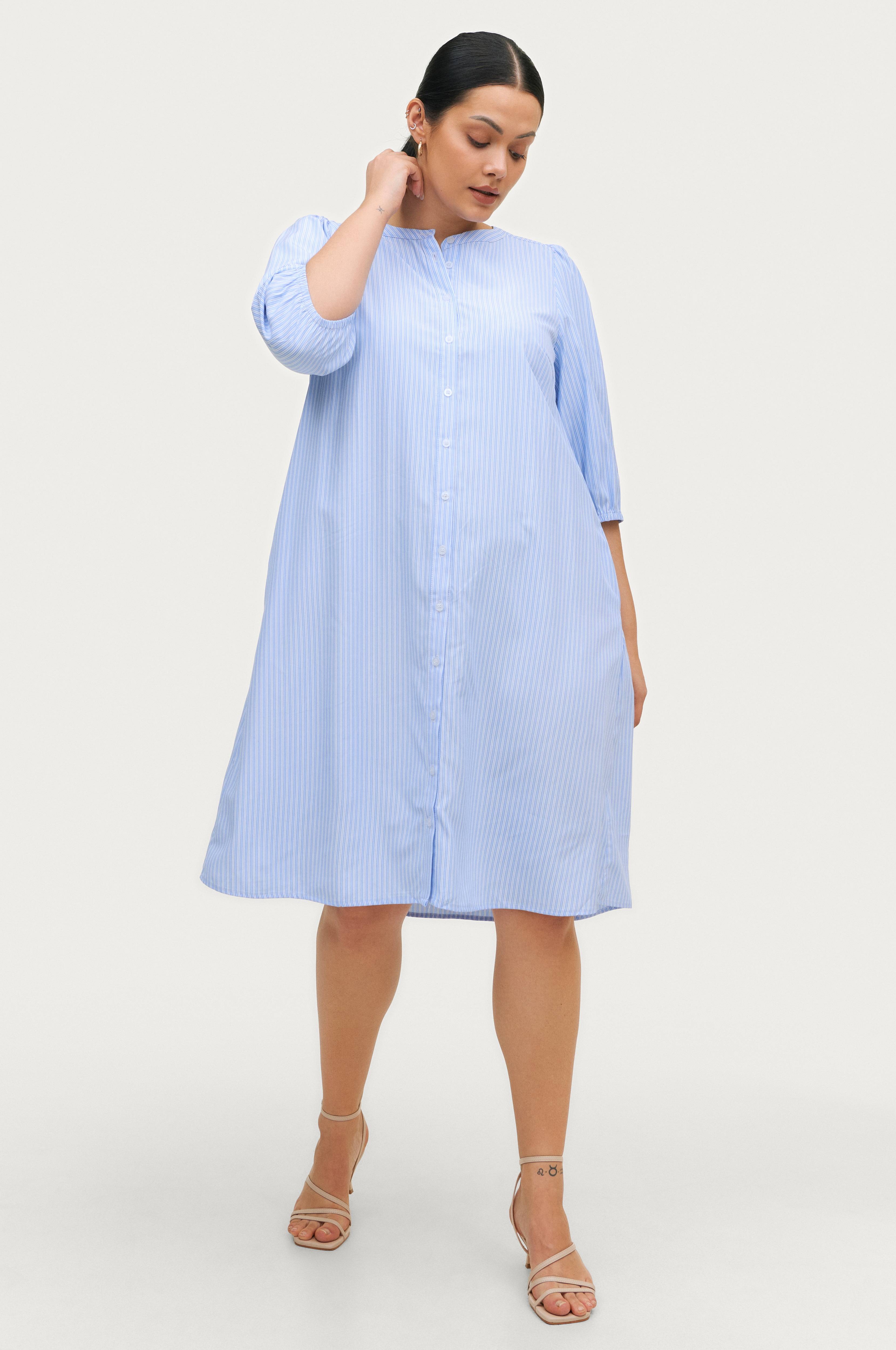 • A-linje design• Knapper foran• Rund hals• 3/4 lange ballonærmer med elastiske manchetter• Lommer i siderne• Store størrelser• Længde: 111 cm i størrelse 44