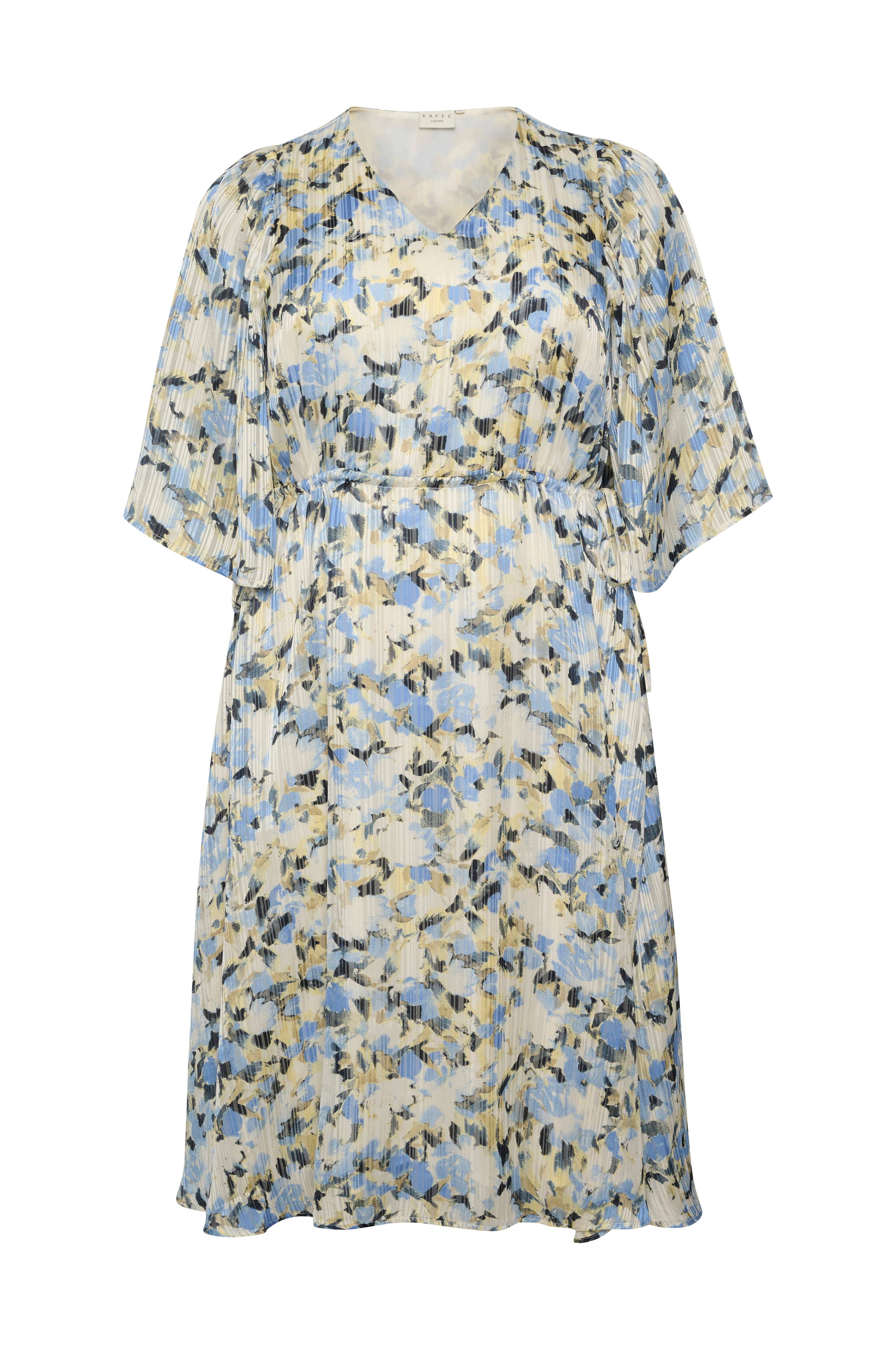 • V-udskæring• Træksnørre ved taljen• Brede, 3/4 lange sommerfugleærmer• Kvalitet med glans• Vævet for• Store størrelser• Længde: 122 cm i størrelse 44
