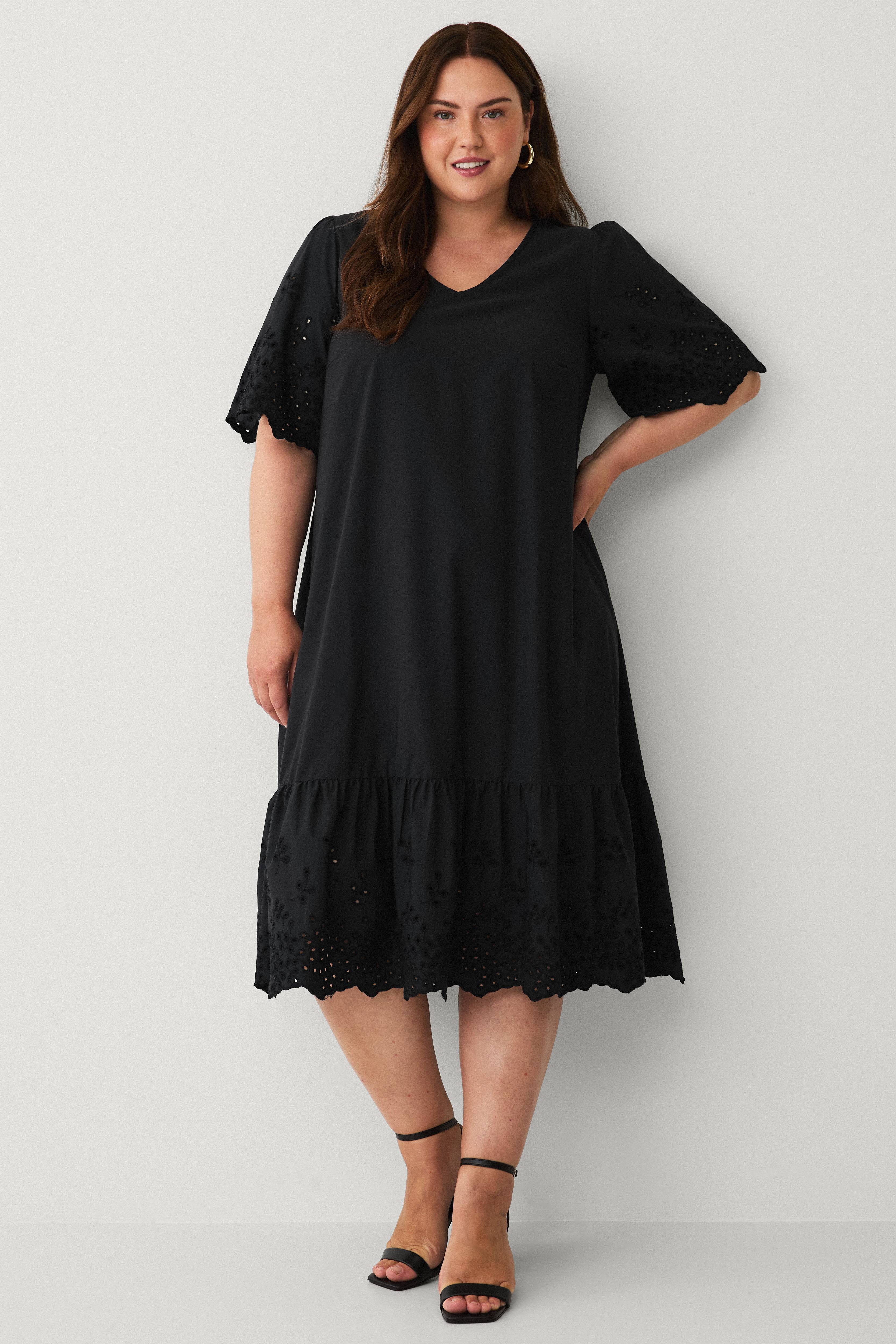 • Kjole med hulbroderede detaljer• V-udskæring• 2/4 længdee ærmer• Bred volant nederst• Afslappet pasform• Plusstørrelser• Længde: 117 cm i størrelse 44