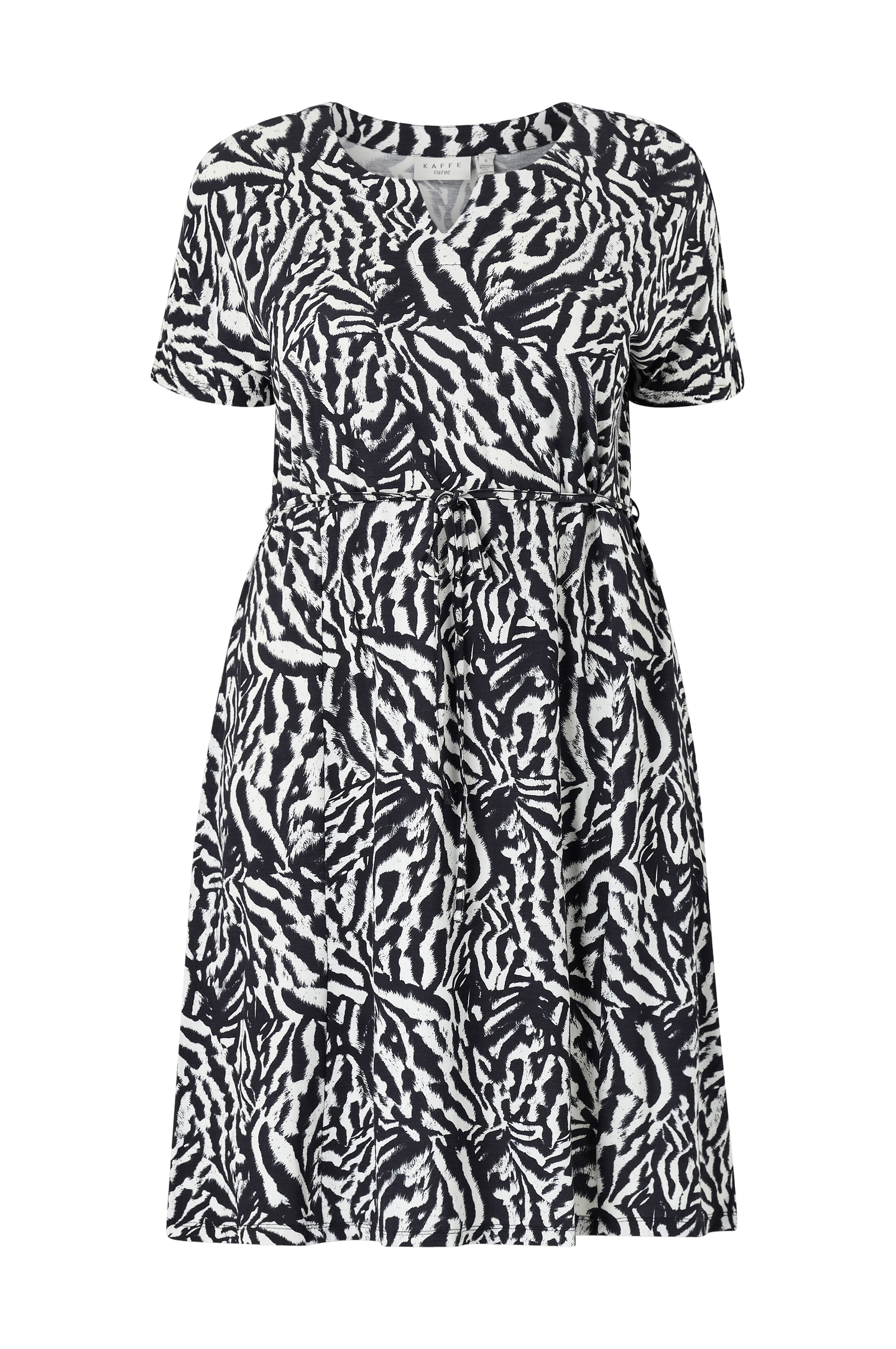 • Mønstret kjole i elastisk jersey• Rund, bred halsudskæring med ventilation foran• Korte ærmer• Tyndt, aftageligt bindebælte ved taljen• Store størrelser• Længde: 106 cm i størrelse S