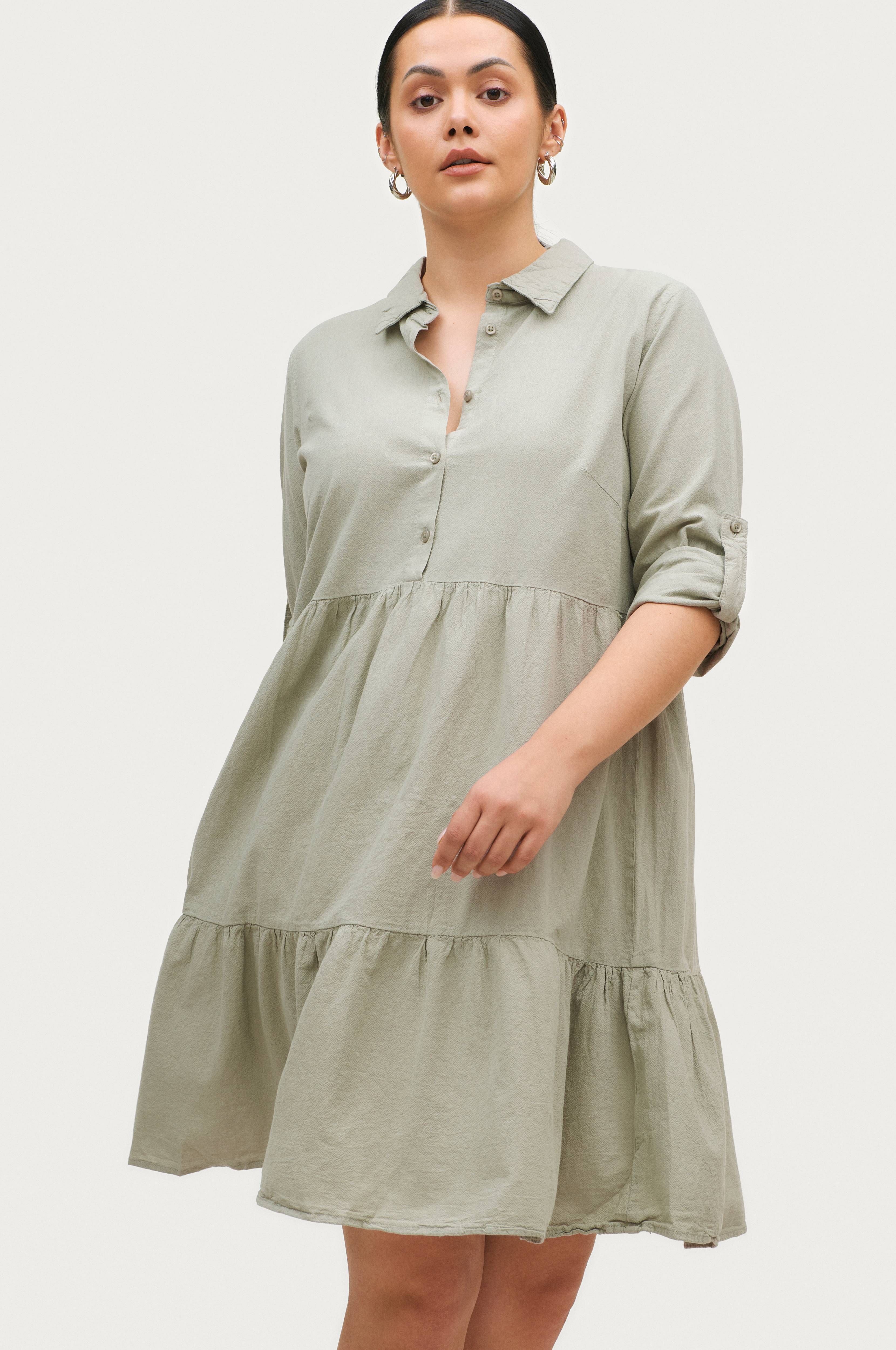 • Model med svaj med volant• Knapper oppe foran• Langt ærme med oprulningsdetalje• Kvalitet med struktur• Store størrelser• Længde: 102 cm i størrelse 44