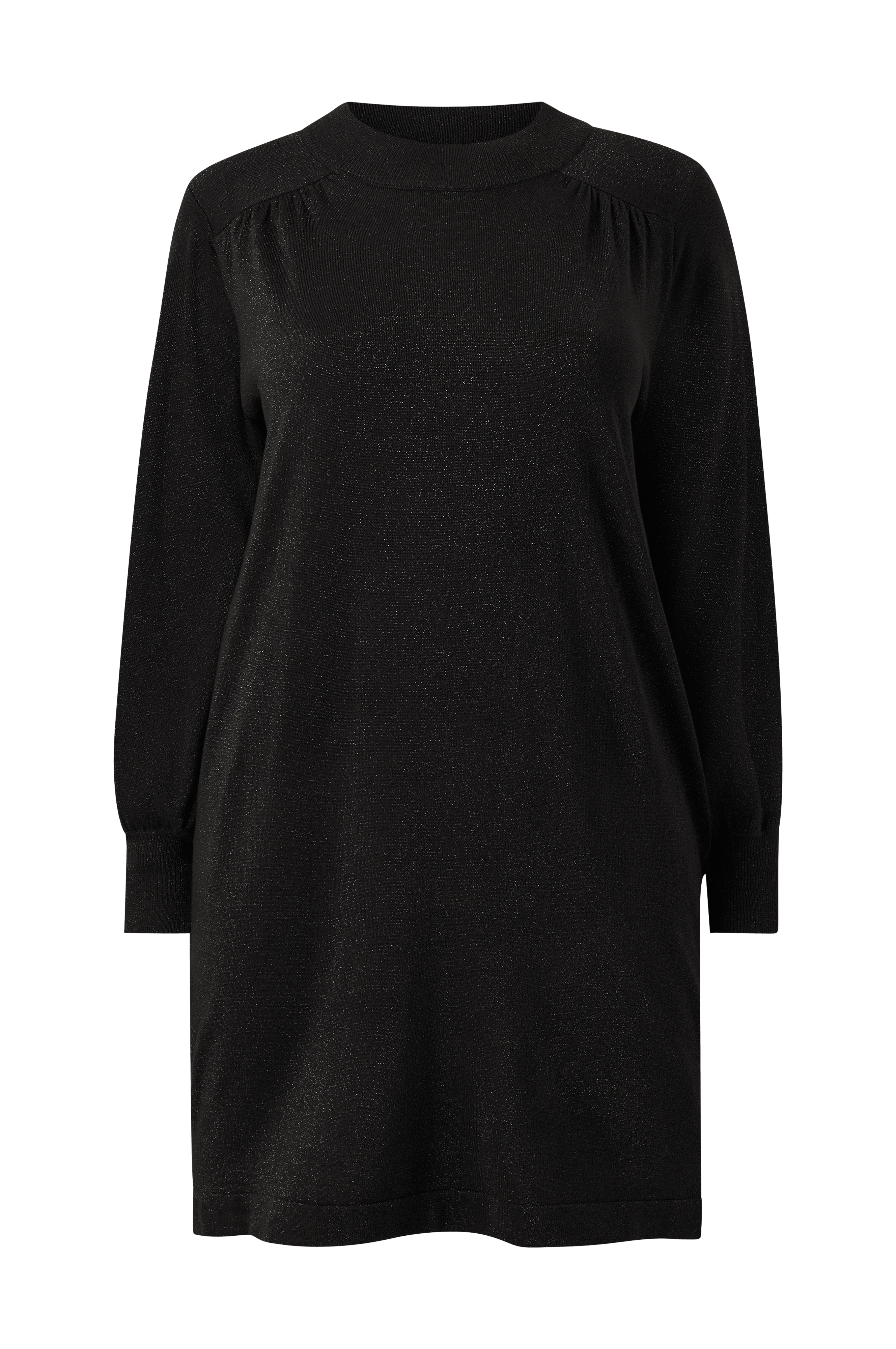 • Glitrende kjole• Tynd, fintstrikket kvalitet• Bred ribstrik i halsen• Samling ved skuldrene• Ballonærmer med manchet• Store størrelser• Længde: 96 cm i størrelse S