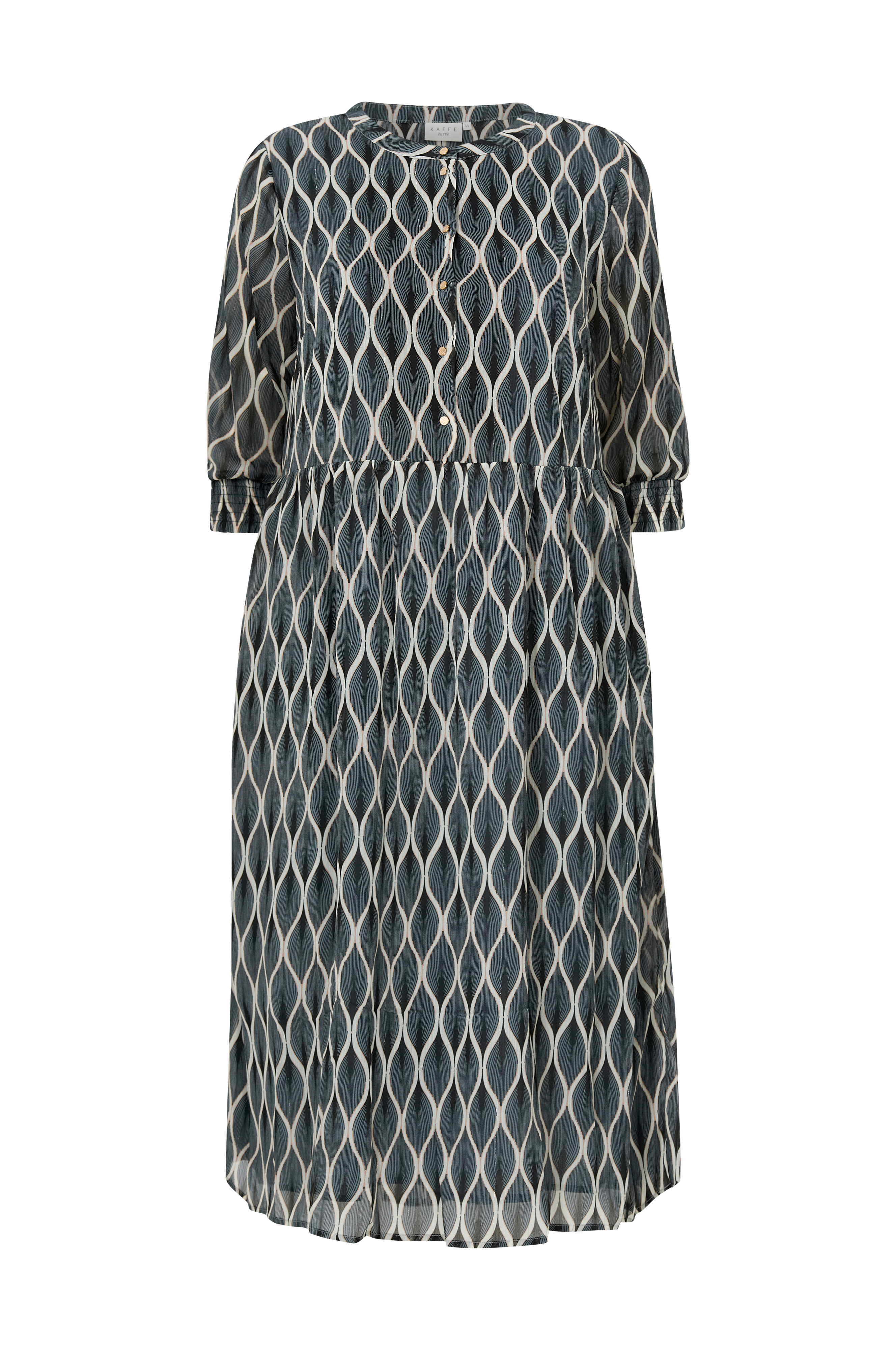 • Læglængde model• Knapper oppe foran• 3/4 langt ærme med smock• Lommer i siderne• Vævet kvalitet med glimmertråd• Foret• Længde: 128 cm i størrelse 44