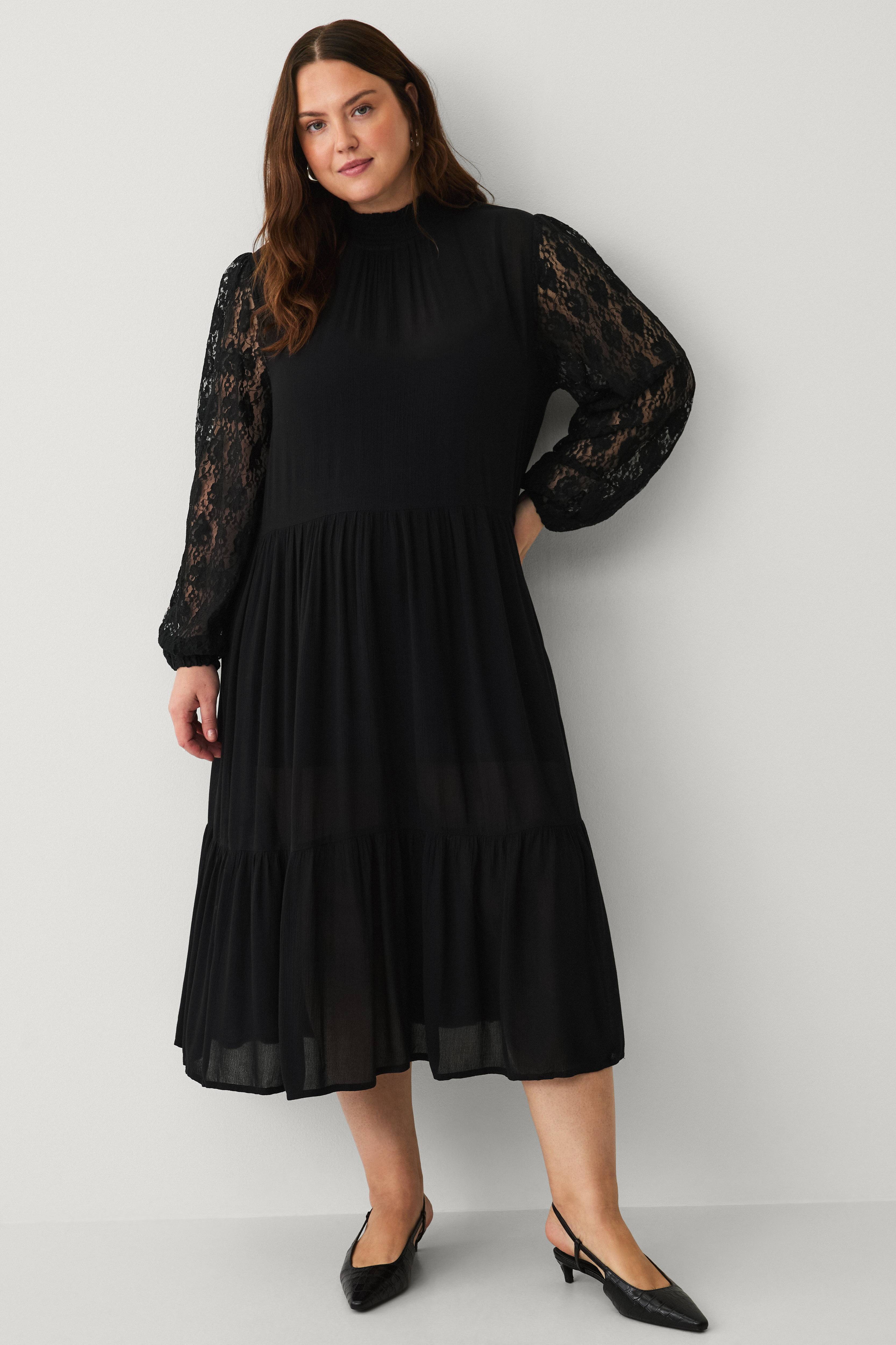 • Tynd, semitransparent midikjole i let krøllet materiale • Løs pasform • Smocket krave • Nøglehulsåbning med knapper i nakken • Lange pufærmer i blonde med elastik ved manchetterne • Rynket udskæring ved taljen • Volant nederst • Plusstørrelser • Længde: 126 cm i størrelse 44