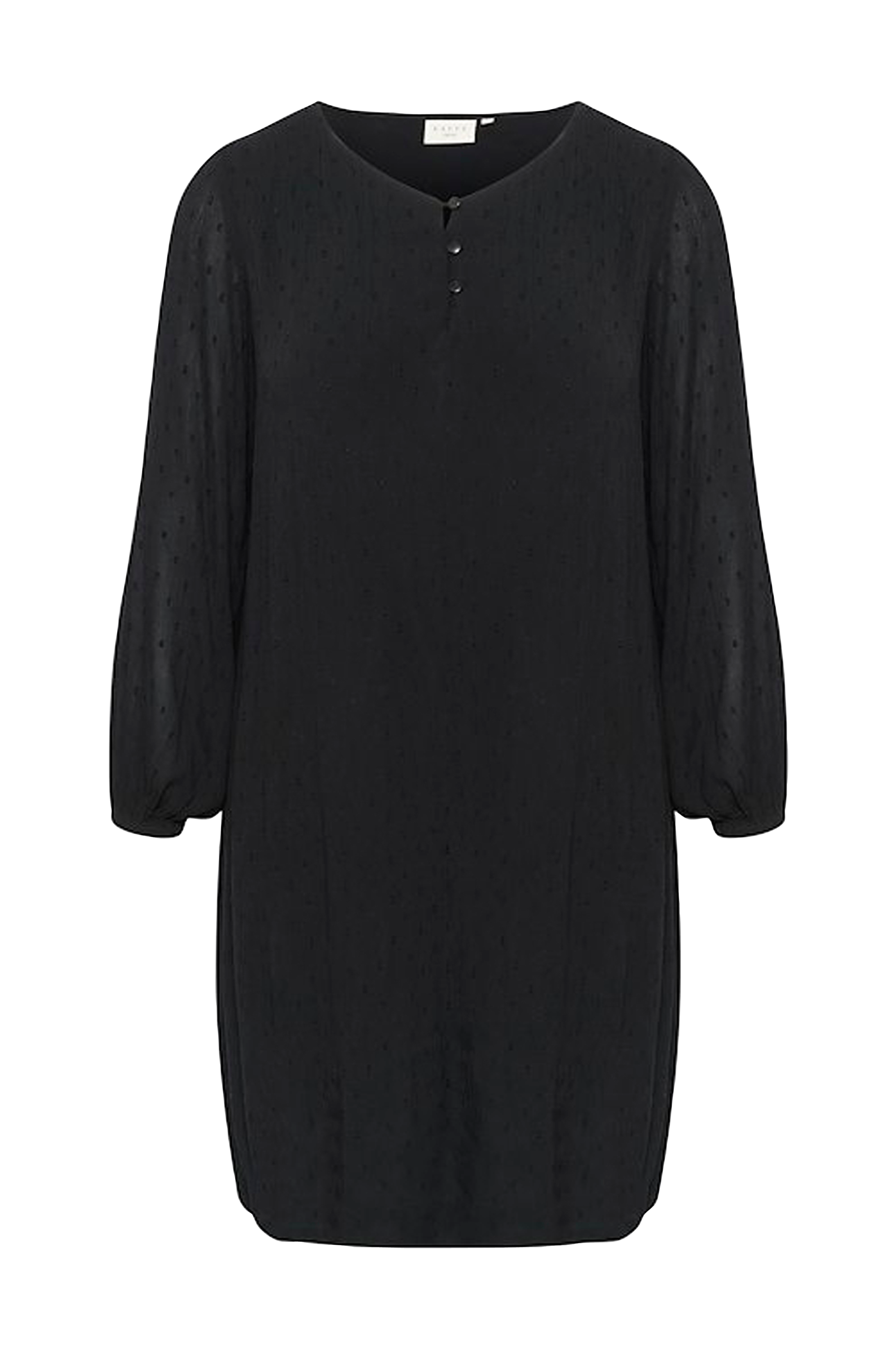 • Foret kjole med mønstervævet stof• V-formet halsudskæring• Tre knapper• Lange ærmer med elastik ved manchetterne• Store størrelser• Længde: 111 cm i størrelse 44
