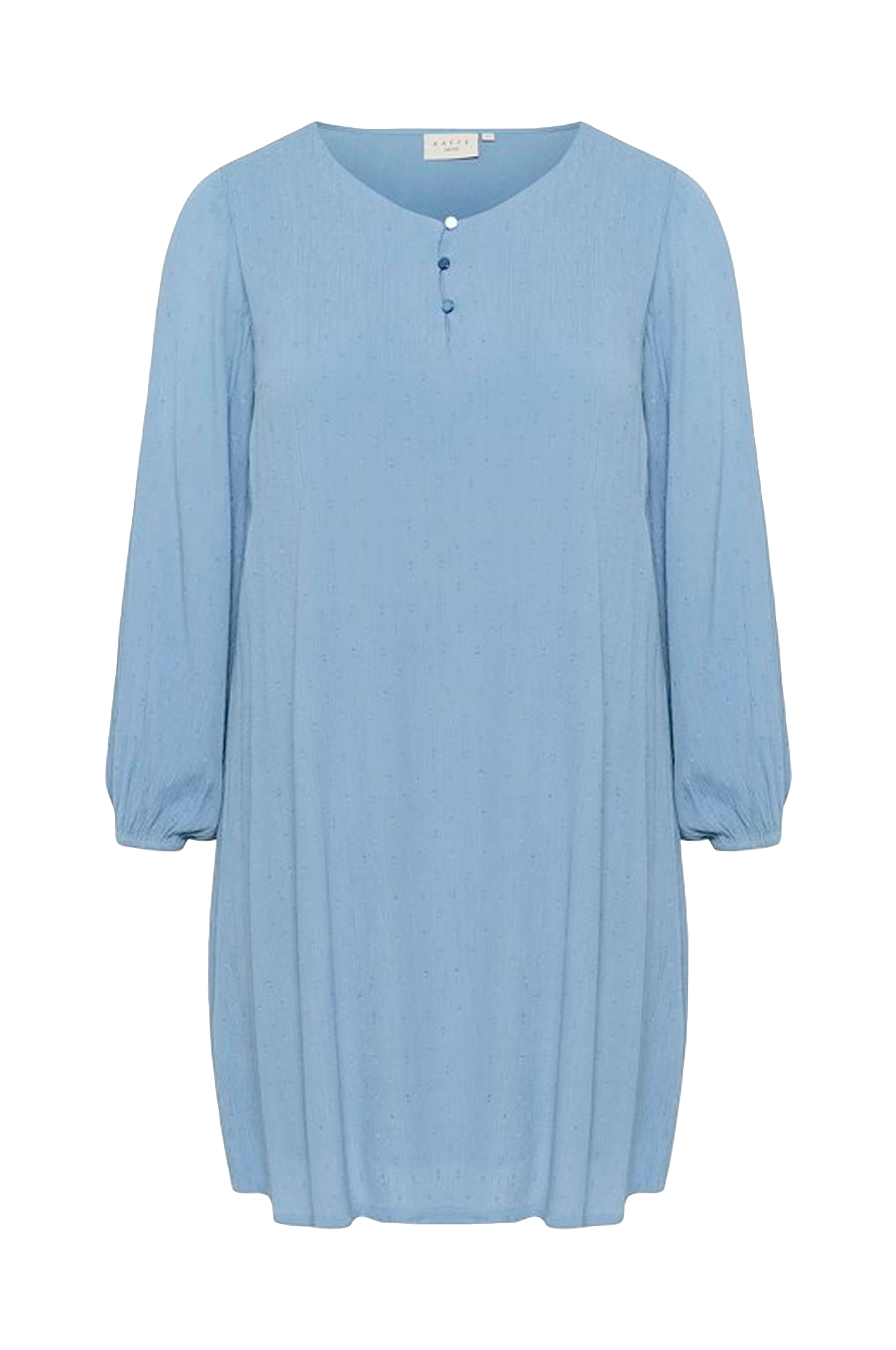 • Foret kjole med mønstervævet stof• V-formet halsudskæring• Tre knapper• Lange ærmer med elastik ved manchetterne• Store størrelser• Længde: 111 cm i størrelse 44